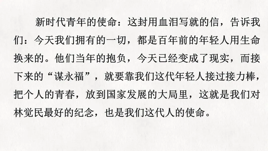 4.文化传承与理解:感悟革命先辈“为天下人谋永福”的家国情怀,思考新时代青年的使命担当。
