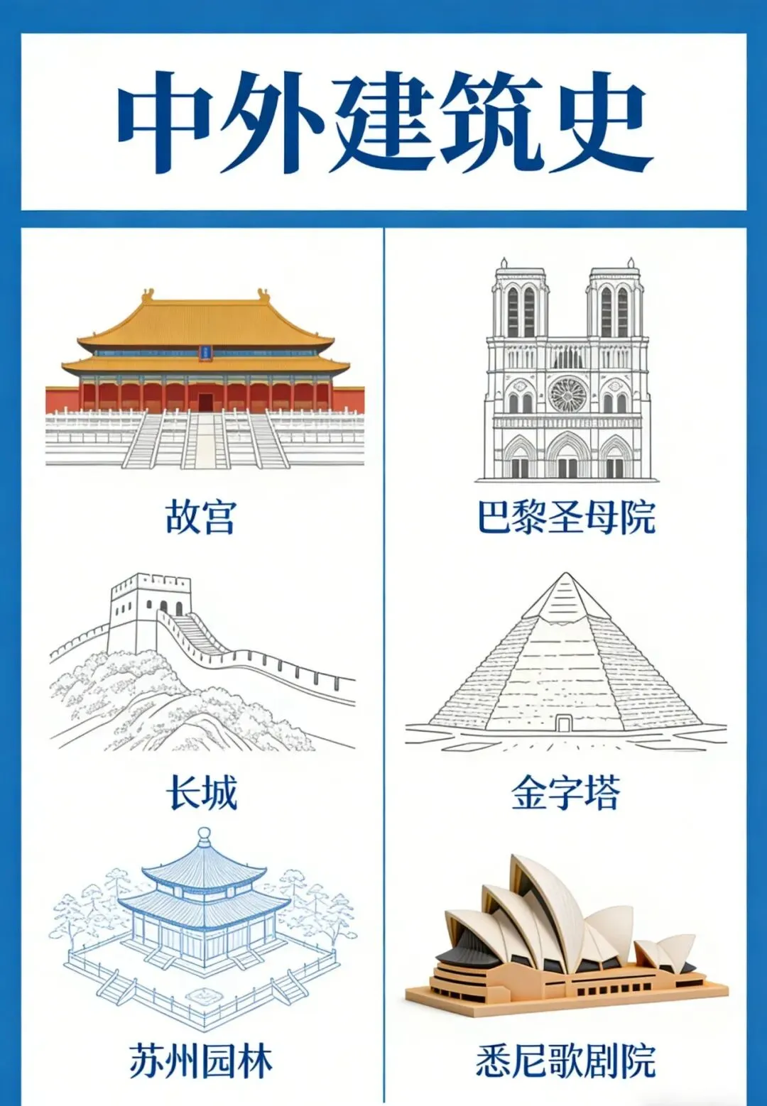 更多优质“PPT”“文档“”表格“”简历“资源关注我每天更新,一定要点个关注不迷路哦!另外本号接入了智能AI可以智能回复本号所有资源哦,快试试吧。建筑是凝固的历史,每一座经典建筑都藏着时代的审美、技术与信仰。从中式飞檐斗拱到西式穹顶立柱,不同文明用砖石木瓦书写着各自的故事。这篇短文带你快速穿越中外建筑史,看懂那些跨越千年的设计智慧。中国传统建筑以 “木构体系” 为核心,讲究 “天人合一” 的哲学思想,核心风格贯穿三千年未改。先秦至秦汉:奠基与雄浑西周 “四合院” 雏形奠定中国民居格局,秦阿房宫、汉未央宫以宏大尺度彰显皇权至上,木构架技术初步成熟,斗拱开始出现,为后世建筑打下基础。唐宋:鼎盛与雅致唐代建筑气魄宏伟,如五台山佛光寺,屋顶坡度平缓,斗拱硕大,体现 “雄健质朴” 的时代气质;宋代建筑趋向精巧,《营造法式》的颁布规范了建筑形制,苏州园林兴起,追求 “虽由人作,宛自天开” 的自然意境。明清:成熟与规整紫禁城成为礼制建筑的巅峰,中轴对称、红墙黄瓦象征皇权等级;民居建筑百花齐放,皖南徽派的马头墙、福建土楼的防御布局、山西晋商大院的精巧雕刻,皆体现地域文化与实用功能的完美结合。西方建筑以 “石构体系” 为主线,从宗教崇拜到人文觉醒,风格迭代鲜明。古希腊罗马:理性与秩序古希腊建筑以帕特农神庙为代表,采用多立克柱式,追求 “黄金比例” 的和谐之美,体现城邦文明的理性精神;古罗马继承并创新,发明混凝土与拱券技术,万神殿的穹顶至今仍是建筑奇迹,彰显帝国的包容与霸气。中世纪:神性的升华哥特式建筑崛起,巴黎圣母院、科隆大教堂以尖拱、飞扶壁、彩色玻璃为特色,高耸的形制指向天空,象征对上帝的虔诚;拜占庭建筑则以圣索菲亚大教堂的穹顶为标志,融合东西方风格,营造神秘庄严的宗教氛围。文艺复兴至近现代:人性的回归与突破文艺复兴时期,佛罗伦萨大教堂穹顶重拾古典秩序,体现人文主义复兴;工业革命后,埃菲尔铁塔用钢铁结构突破传统;现代主义建筑如包豪斯校舍,追求 “形式追随功能”,重塑当代建筑语言。三、中外建筑的核心差异材质:中国以木构为主,追求 “天人合一” 的柔性之美;西方以石构为核心,彰显永恒与庄严的刚性力量。理念:中国建筑重 “礼制” 与 “意境”,如园林的 “藏与露”;西方建筑重 “比例” 与 “逻辑”,如古典建筑的柱式体系。功能:中国建筑以宗族聚居为核心,如四合院;西方建筑以宗教与公共空间为重点,如教堂、剧场。中外建筑史不是孤立的风格演进,而是文明的物质载体。一砖一瓦间,藏着古人对生活、信仰与世界的理解。如今,东西方建筑理念不断融合,传统智慧与现代技术碰撞出新的可能,建筑史的故事仍在继续。[公众号介绍]:本公众号长期免费分享各类文档,表格,PPT,简历模版。只需关注万份PPT,工作学习文档,工作学习表格,专业合同,高级简历免费获得。各类文档,表格,PPT,简历模版