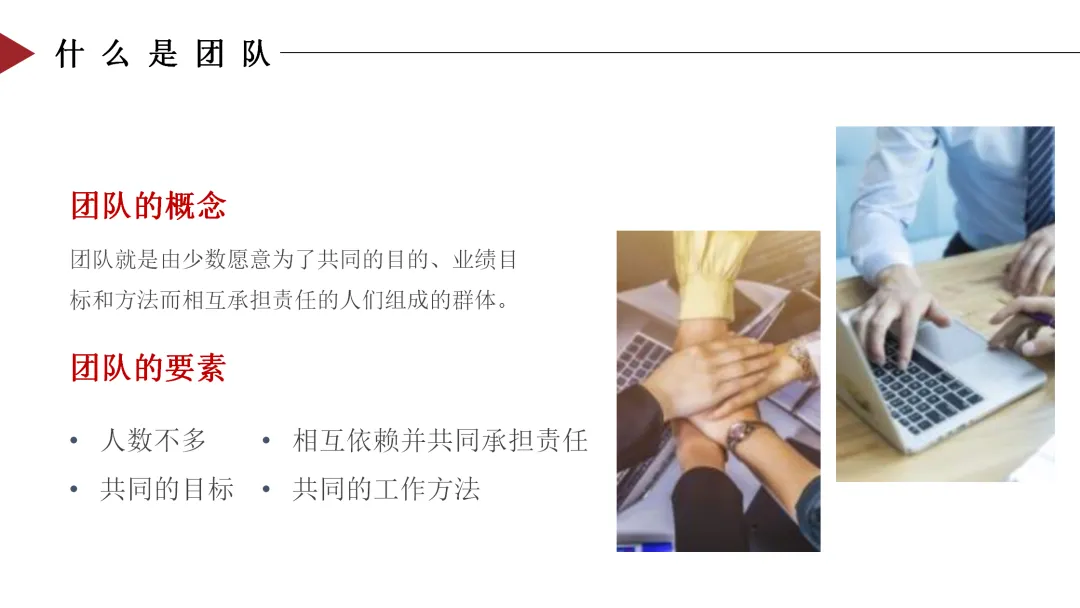 团队,就是由少数愿意为了共同的目的、业绩目标和方法而相互承担责任的人们组成的群体。