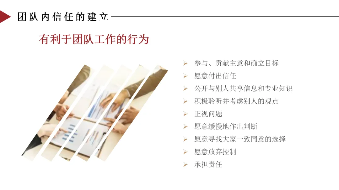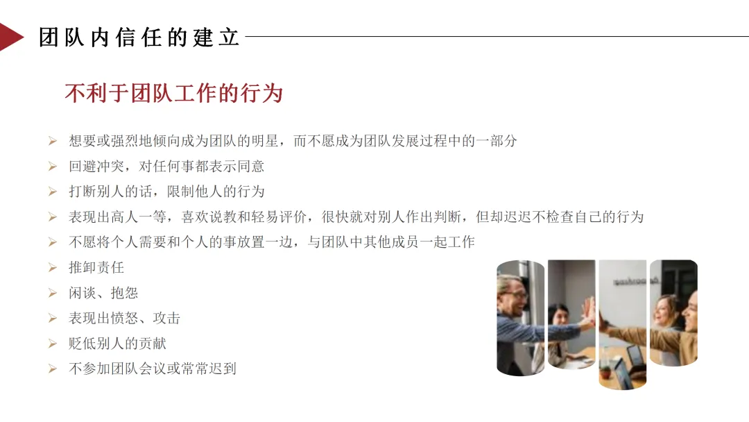 与上述破坏性行为相对,我们来看看哪些行为能够促进团队合作、建立团队信任: