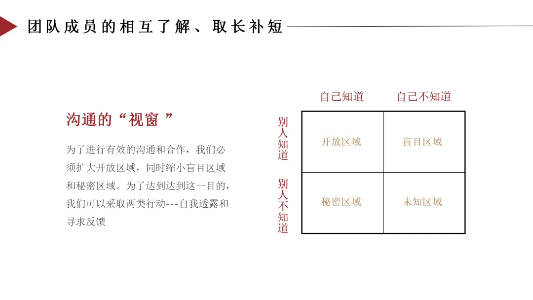 相互的信任——成员之间建立起深厚的信任关系,相信彼此的能力和品格,敢于暴露弱点,敢于承担风险。