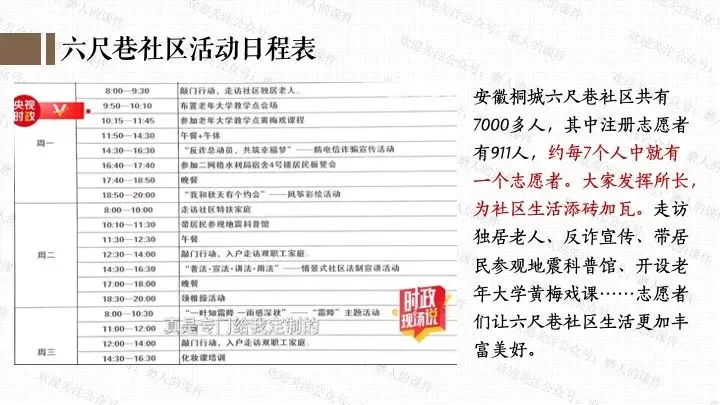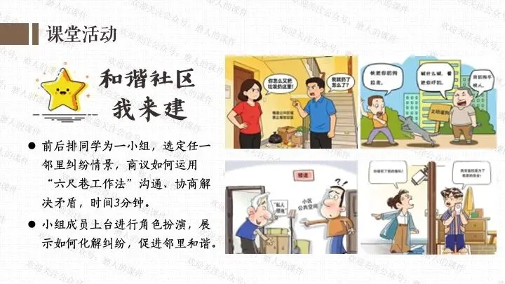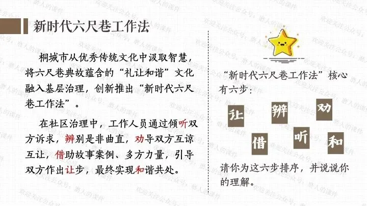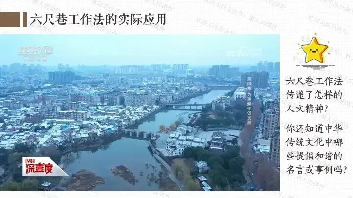本课我以六尺巷为线索,一案到底。从“中国社区”标识引入课题,来到六尺巷;通过六尺巷工作法、课堂活动“和谐社区我来建”,学习弘扬促进社会和谐的思想文化;通过六尺巷志愿者的故事、了解不同的志愿服务、课堂活动“校园榜样推荐会”,学习向上向善的思想文化。最后呈现本课的知识框架。课件逻辑清晰,素材丰富,兼具知识讲授和价值引导。