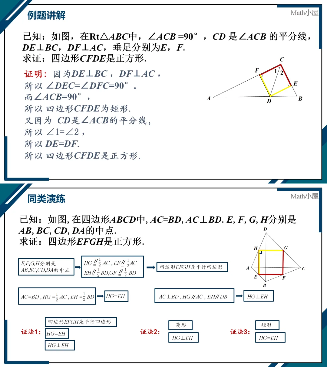 1️⃣ 角平分线 + 双垂直 → 先证矩形,再证邻边相等 → 正方形2️⃣ 中点四边形 + 对角线垂直相等 → 先证菱形,再证直角 → 正方形3️⃣ 菱形对角线 + 特殊角 → 先证菱形,再证直角 → 正方形