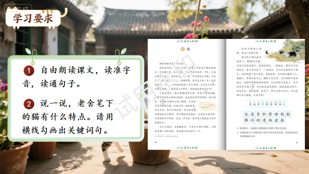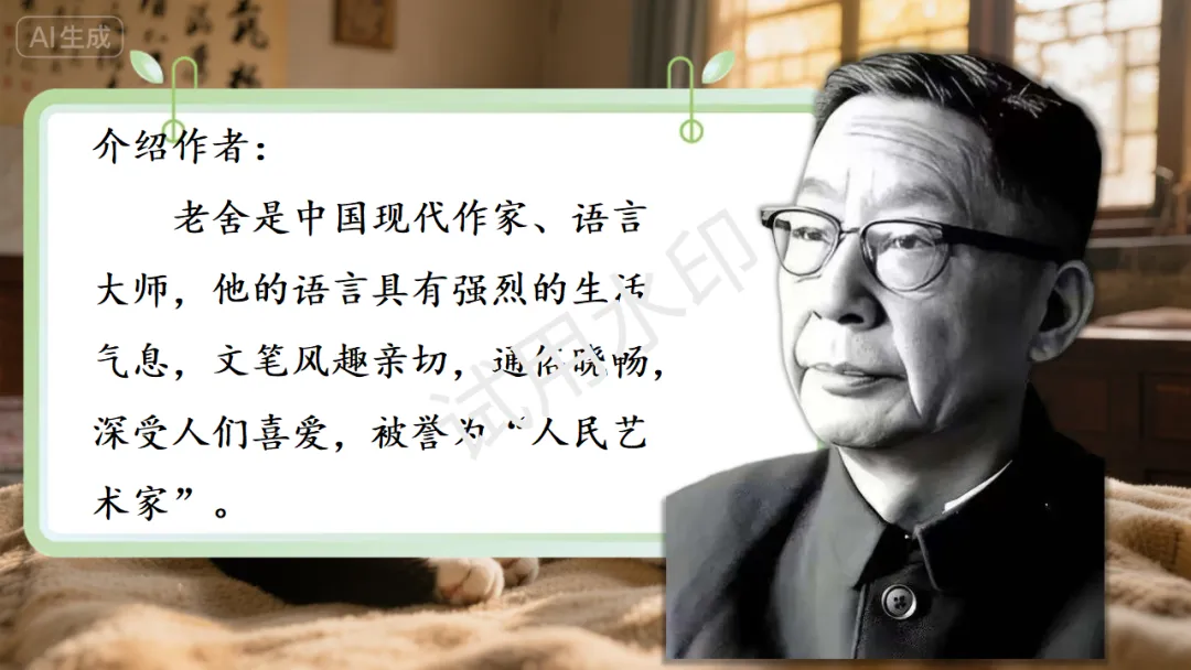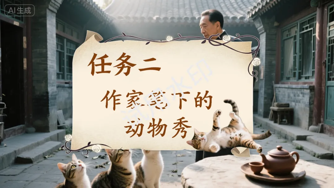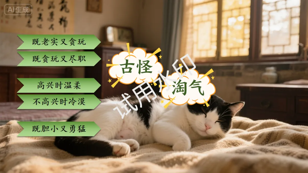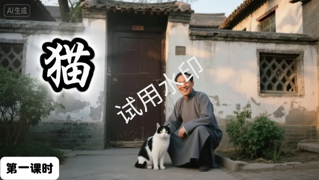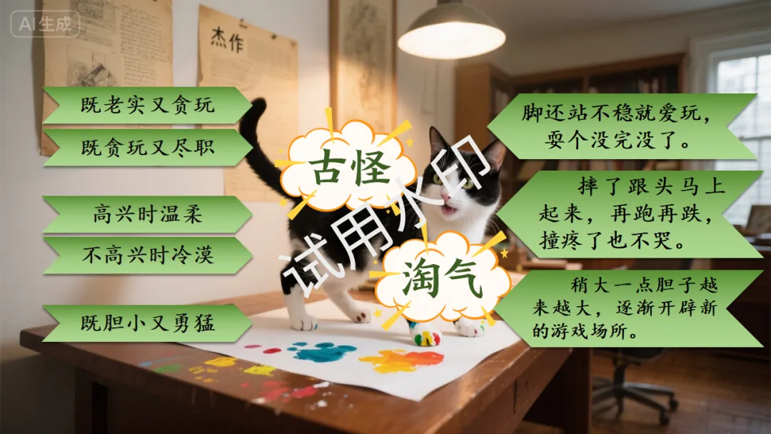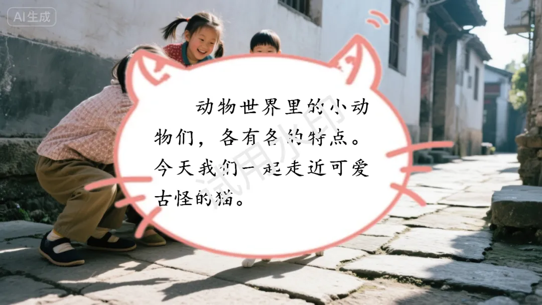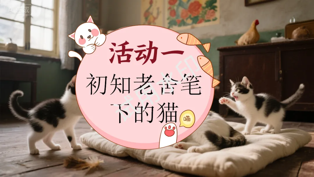 播放AI视频:同学们,你们见过这样的猫吗?它有时候特别乖,会找个暖和地方睡大觉,什么事都不管;可一旦决定出去玩,能出走一天一夜,谁叫都不回来!说它贪玩吧,可听到老鼠的一点儿响动,又会屏息凝视好几个钟头,非把老鼠等出来不可。这只性格 “又乖又野、又贪玩又尽职” 的猫,就是老舍先生笔下的小可爱!他还说这只猫高兴时会蹭腿、踩梅花印,不高兴时就一声不吭,连碰都不碰稿纸。你们觉得这只猫的性格是不是很古怪?今天咱们就当 “猫咪性格探秘者”,翻开《猫》这篇课文,一起找找老舍先生笔下的猫,还有哪些让人觉得 “古怪” 的地方,看看这只古怪的猫到底有多可爱!