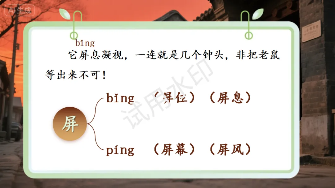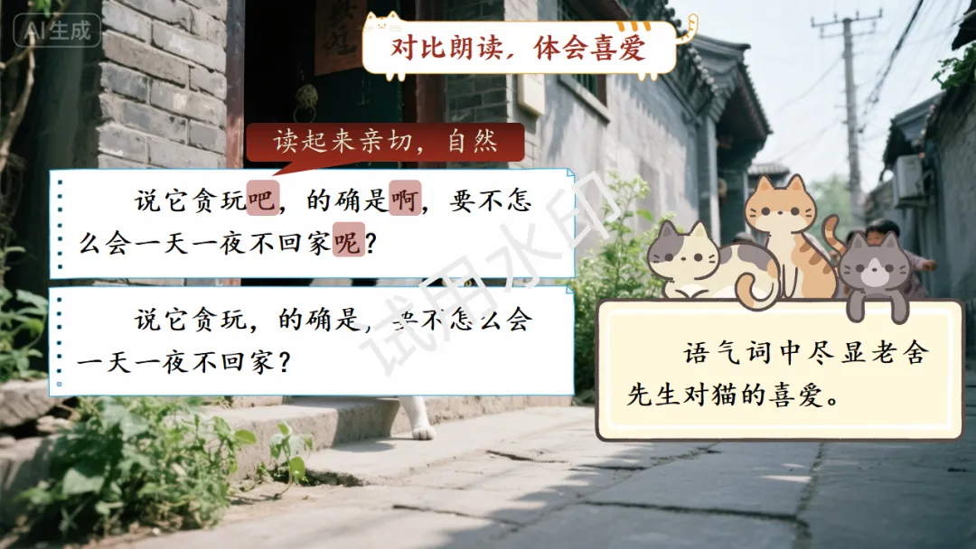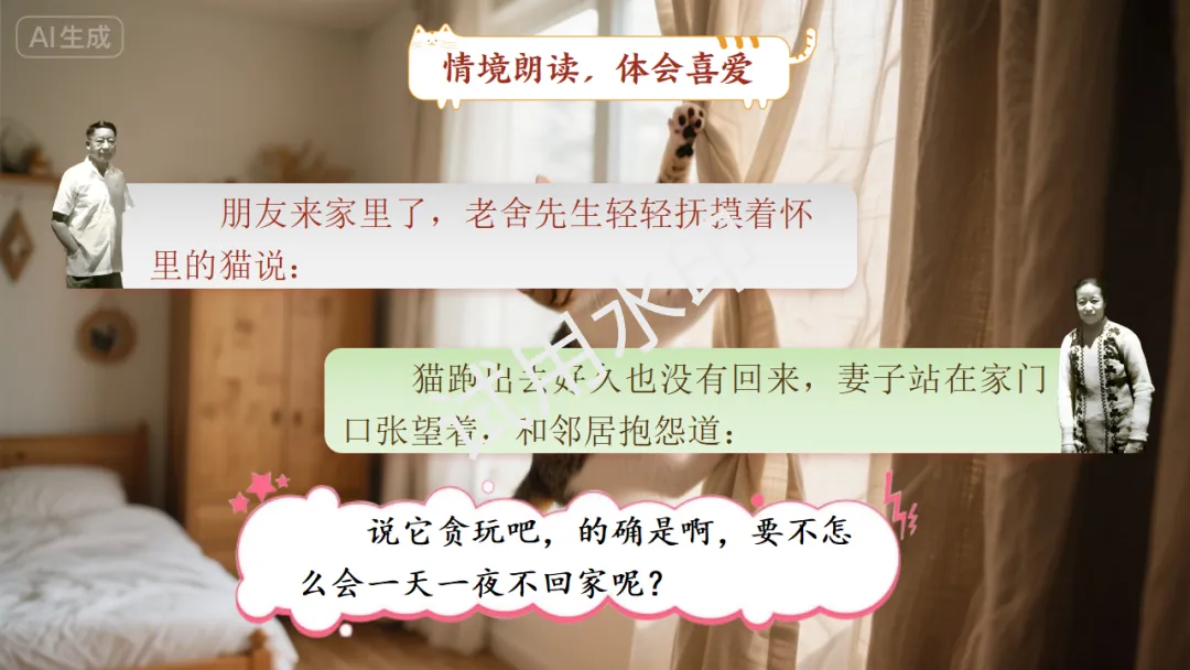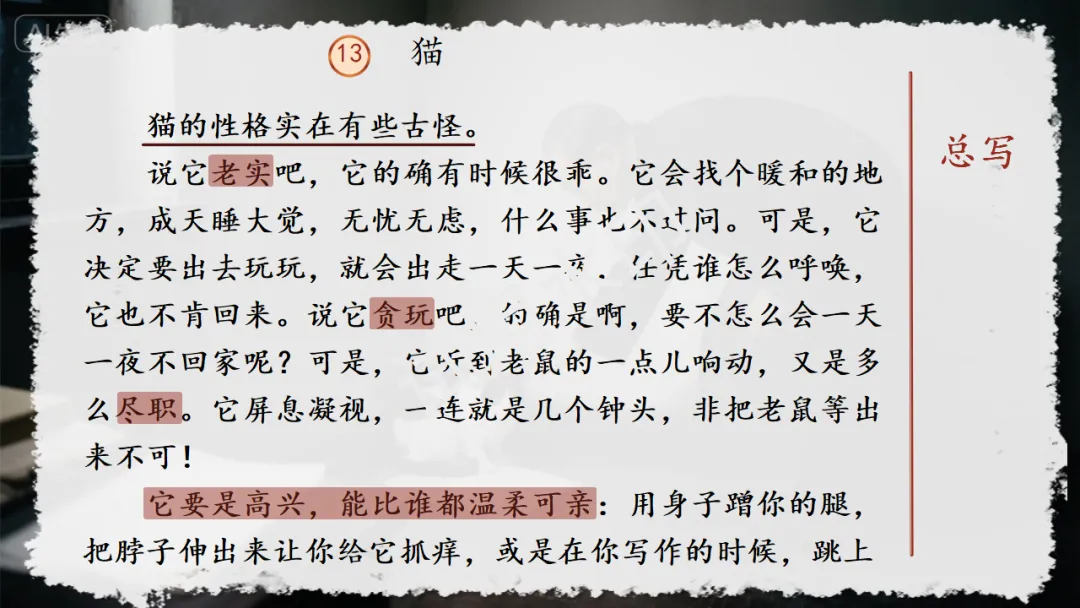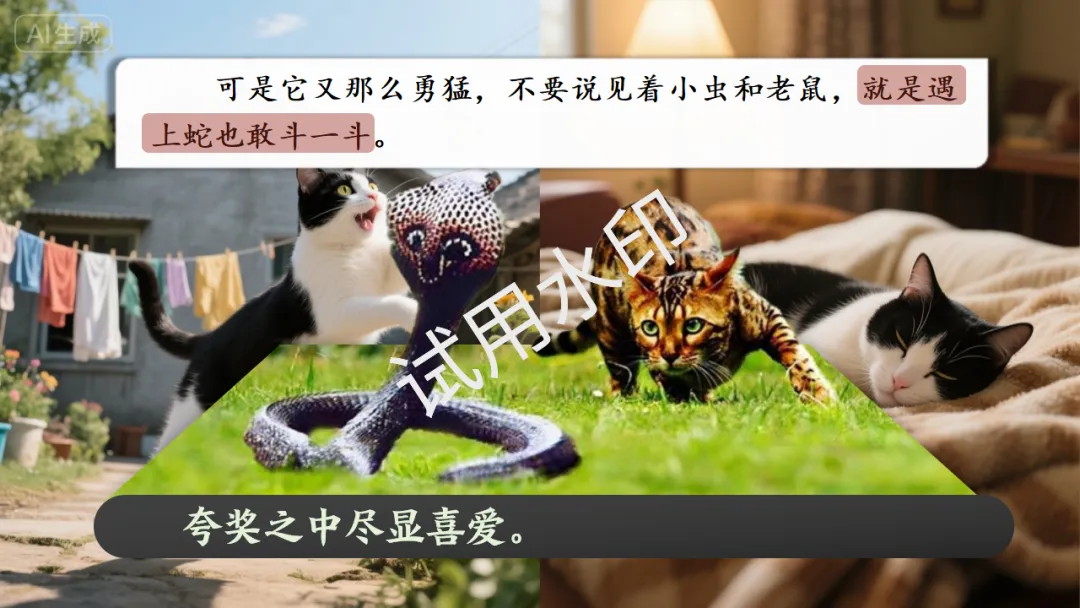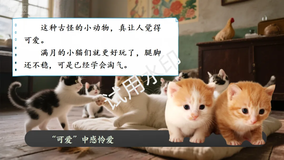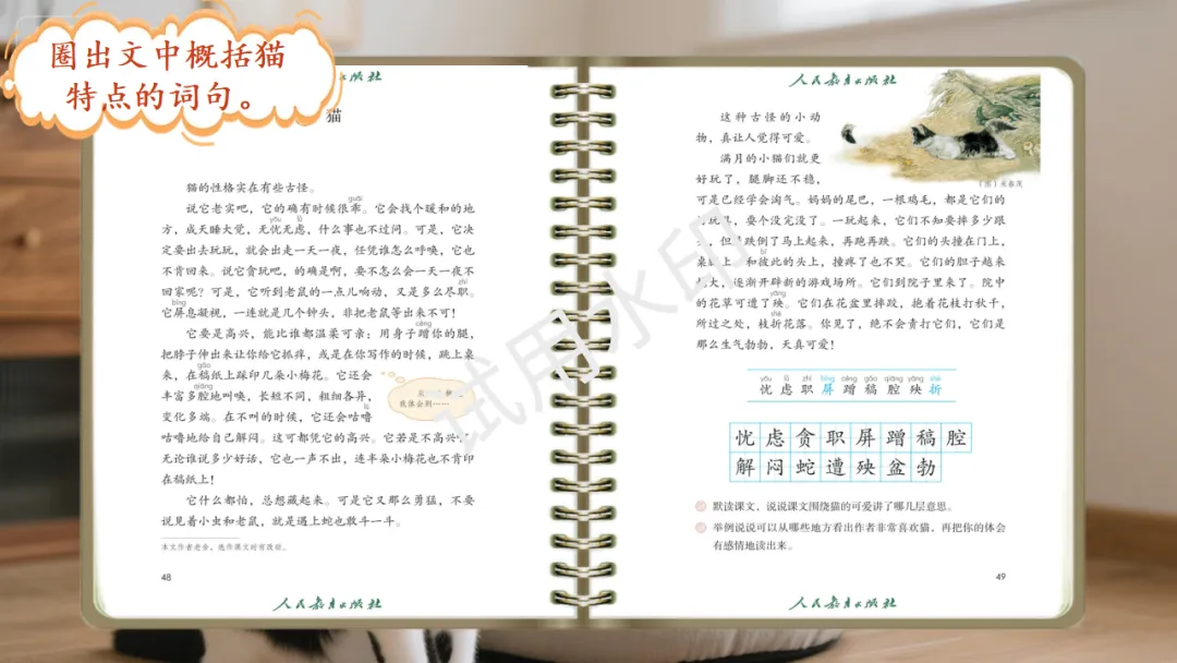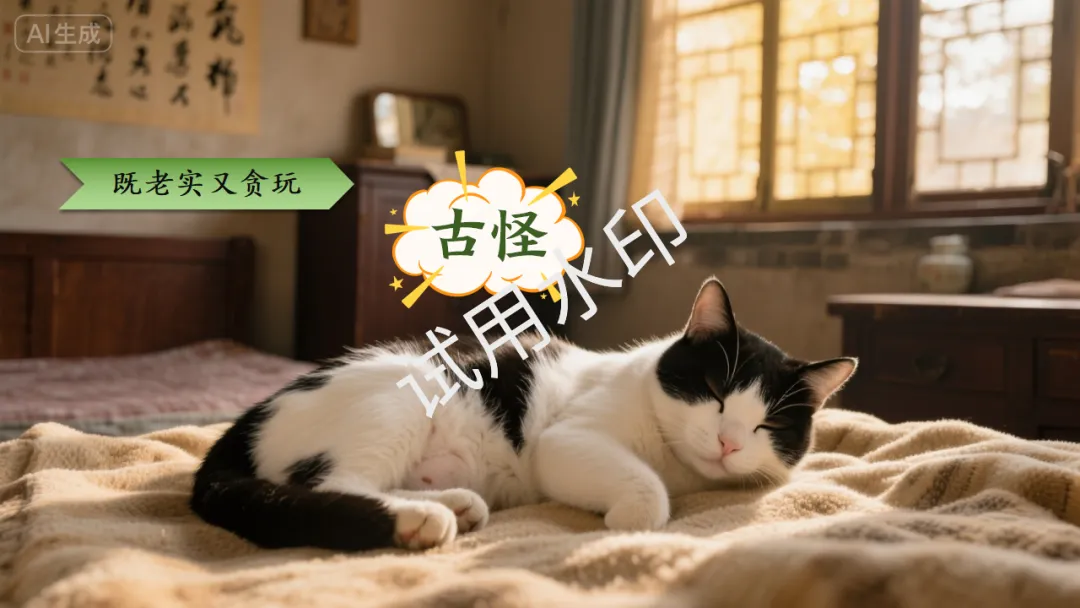播放AI视频:同学们,你们见过这样的猫吗?它有时候特别乖,会找个暖和地方睡大觉,什么事都不管;可一旦决定出去玩,能出走一天一夜,谁叫都不回来!说它贪玩吧,可听到老鼠的一点儿响动,又会屏息凝视好几个钟头,非把老鼠等出来不可。这只性格 “又乖又野、又贪玩又尽职” 的猫,就是老舍先生笔下的小可爱!他还说这只猫高兴时会蹭腿、踩梅花印,不高兴时就一声不吭,连碰都不碰稿纸。你们觉得这只猫的性格是不是很古怪?今天咱们就当 “猫咪性格探秘者”,翻开《猫》这篇课文,一起找找老舍先生笔下的猫,还有哪些让人觉得 “古怪” 的地方,看看这只古怪的猫到底有多可爱!