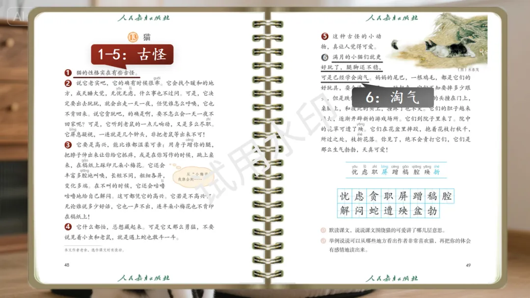 播放AI电话数字人视频:同学们,猫是生活中备受喜爱的生灵,它们时而蜷缩休憩、温顺黏人,时而追逐嬉戏、调皮捣蛋,满是鲜活个性。老舍先生以细腻笔触,将猫的种种模样写得惟妙惟肖、惹人喜爱。今天咱们就一起走进《猫》这篇课文,认识文中猫的多样姿态,感受它的灵动与趣味。