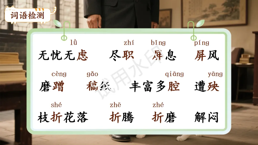 (1)出示:无忧无虑lǜ、尽职zhí、bǐnɡ屏息、pínɡ屏风