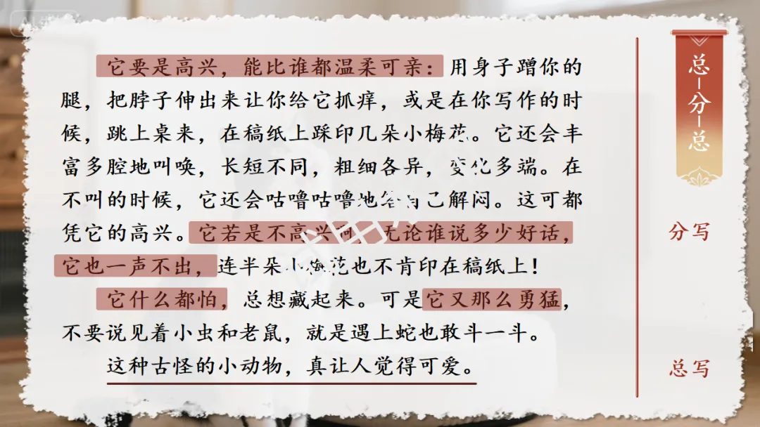 明确段落结构:成年猫部分采用 “总 — 分 — 总” 结构,先总写 “性格古怪”,再分述具体表现,最后总写 “真让人觉得可爱”。