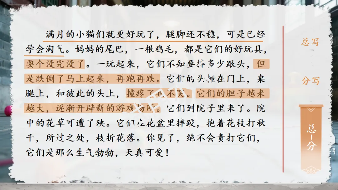 明确段落结构:小猫部分采用 “总 — 分” 结构,先总写 “更好玩、淘气”,再分述具体淘气行为。