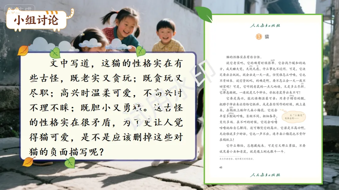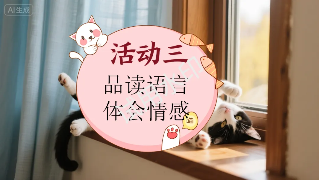 播放活动三视频:老舍先生的文字平实又饱含深情!这节课咱们聚焦精彩语句,比如描写猫动作、神态的段落,品读其中的用词妙处。从 “蹭你的腿”“踩印小梅花” 等细节里,感受猫的可爱;从字里行间体会老舍先生对猫的喜爱之情,说说这些语言如何让猫的形象更鲜活动人!
