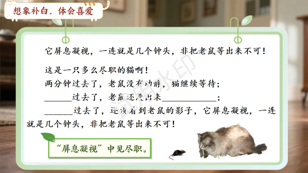 ①出示句子: 它屏息疑视,一连就是几个钟头,非把老鼠等出来不可!