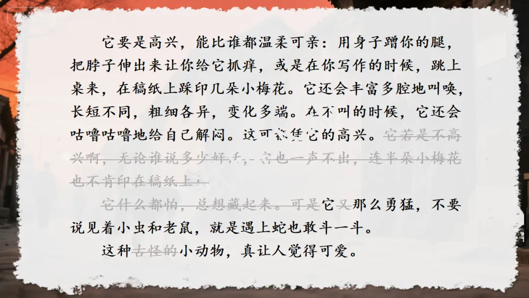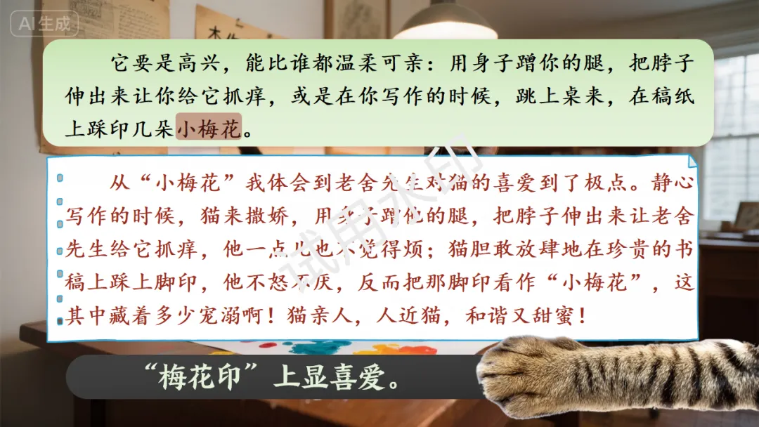 师小结:老舍先生对猫咪可是喜欢到了极点,静心写作的时候,小猫来撒娇,用“身子蹭你的腿 ,把脖子伸出来让你给它抓痒”,他不烦不恼;猫胆敢放肆地在珍贵的书稿上踩上脚印,他不怒不厌,反而把那脚印看成美丽的“小梅花”,这其中藏着多少宠溺,猫亲人,人近猫,真是和谐甜蜜啊!