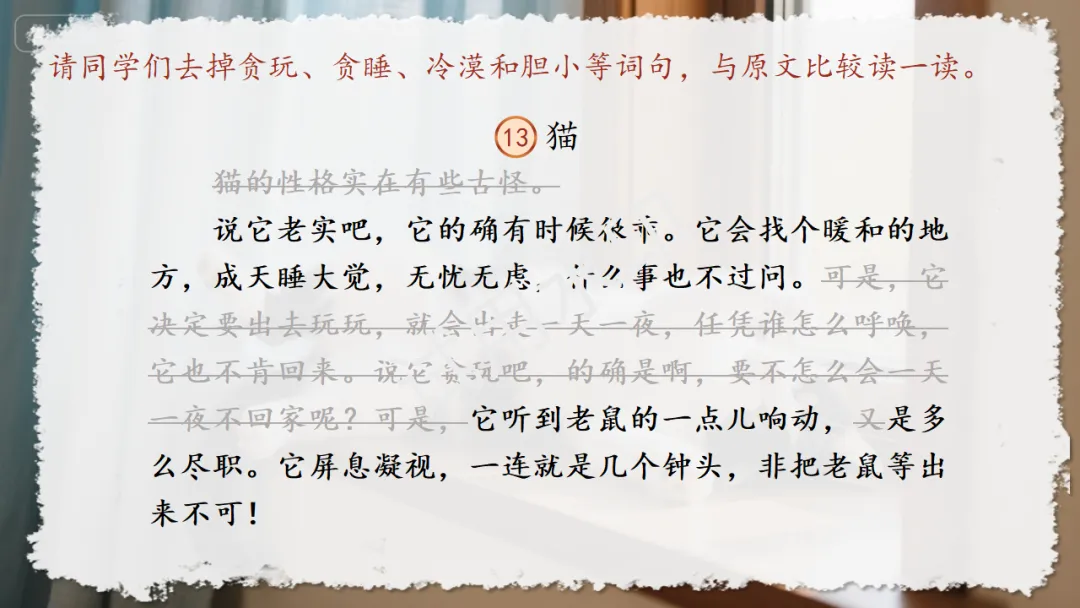 (2)去掉贪玩、贪睡、冷漠和胆小等特点的语句,与原文比较朗读、体会。【结合课件出示的内容进行讲解P32-33】