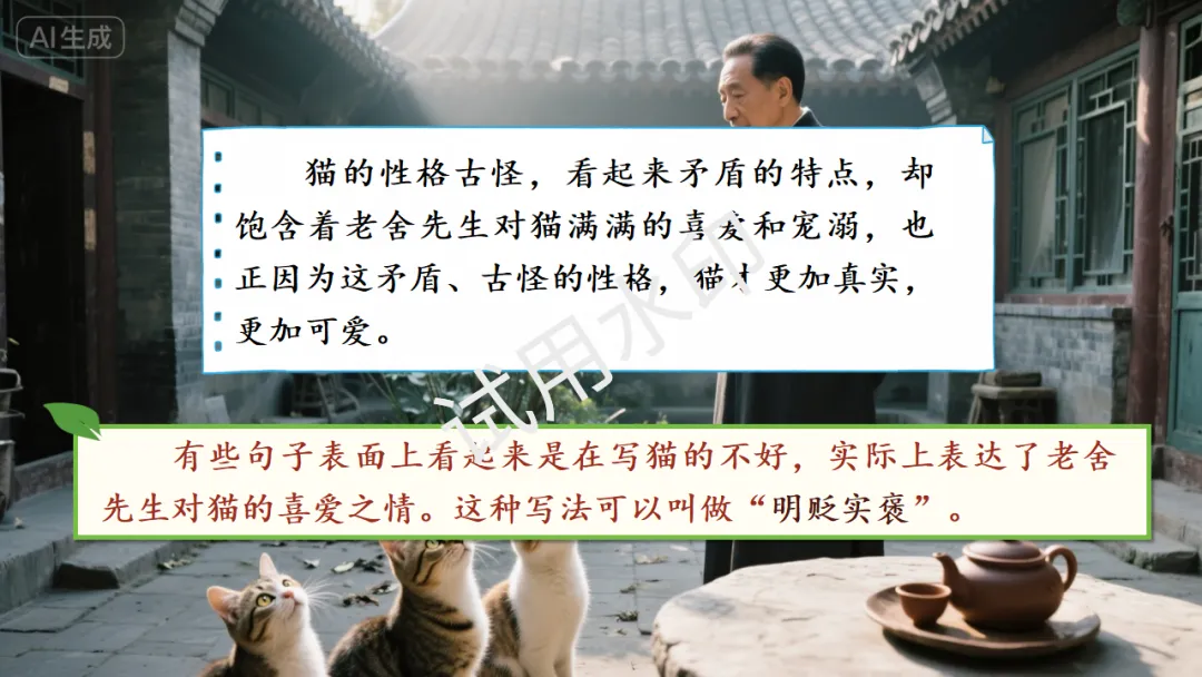 有些句子表面上看起来是在写猫的不好,实际上表达了老舍先生对猫的喜爱之情。这种写法可以叫做“明贬实褒”。