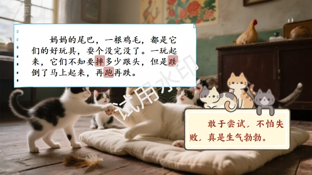 (8)课件出示:妈妈的尾巴,一根鸡毛,都是它们的好玩具,耍个没完没了。一玩起来,它们不知要摔多少跟头,但是跌倒了马上起来,再跑再跌。