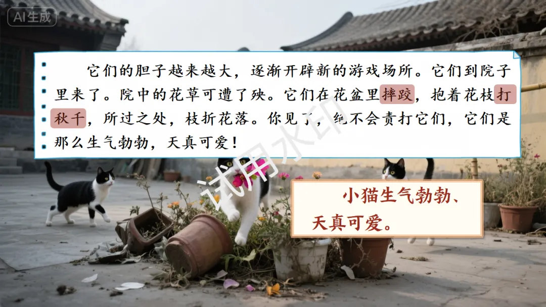 (9)课件出示:它们的胆子越来越大,逐渐开辟新的游戏场所。它们到院子里来了。院中的花草可遭了殃。它们在花盆里摔跤,抱着花枝打秋千,所过之处,枝折花落。你见了,绝不会责打它们,它们是那么生气勃勃,天真可爱!