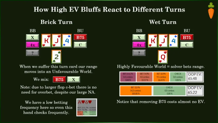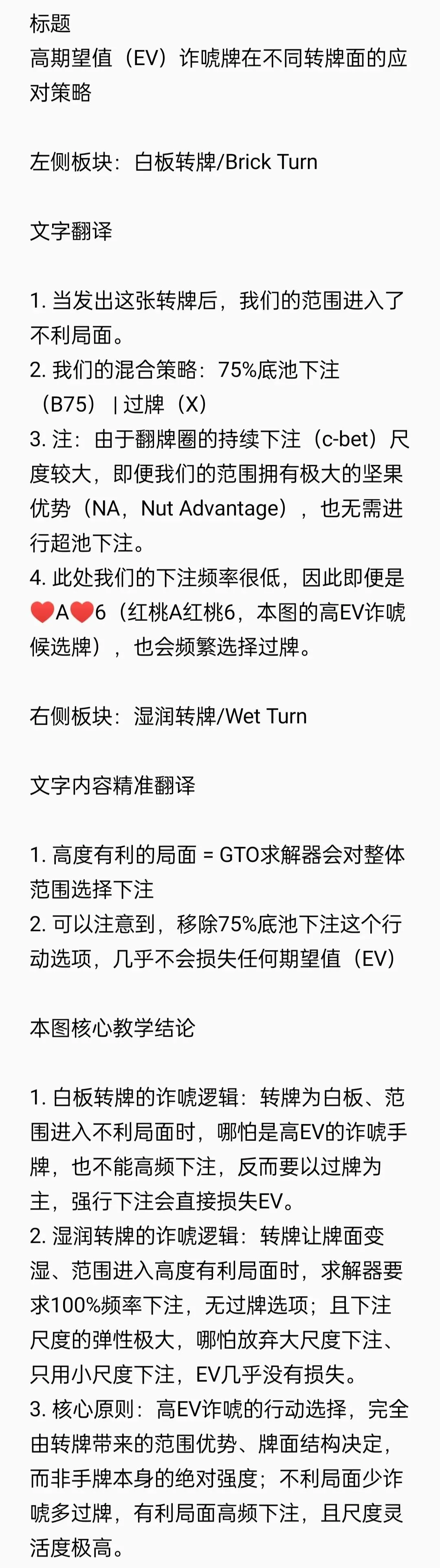 让我们继续讨论高期望值诈唬牌如何对不同转牌做出反应。