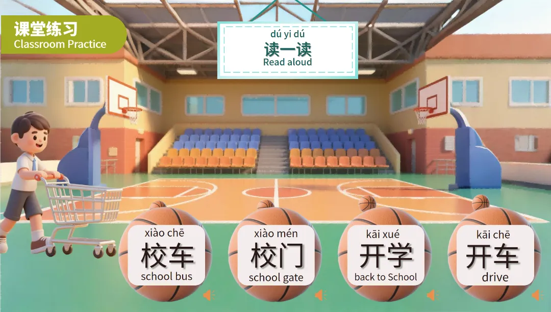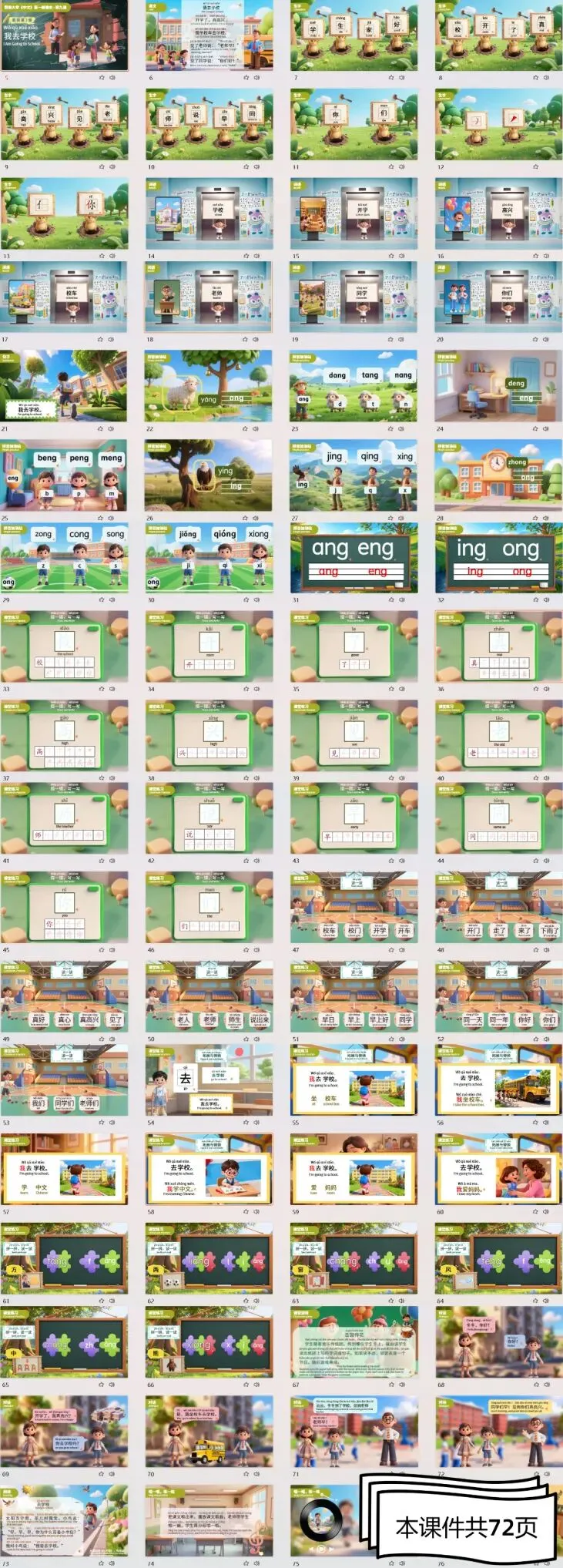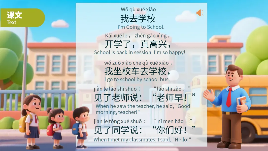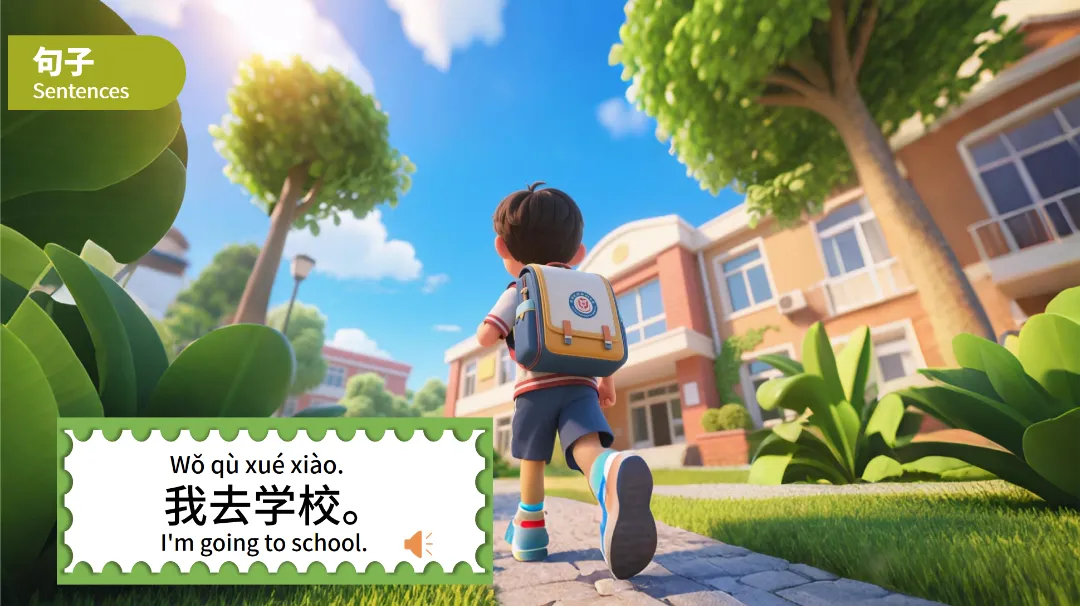 这节「我去学校」课件围绕“校园日常”核心主题展开,覆盖生字、词语、句子、拼音、练习、游戏等多个模块,采用卡通动画+实景化场景设计,特别适合海外华裔和低龄国际学生学习,让汉语课堂告别枯燥。