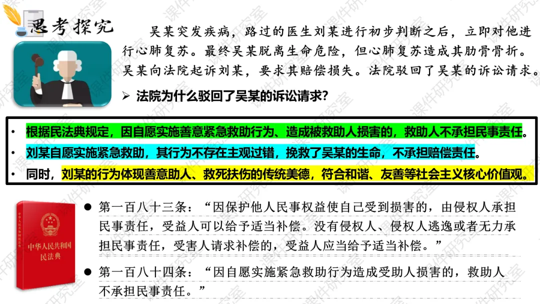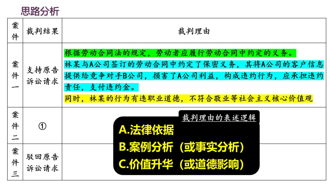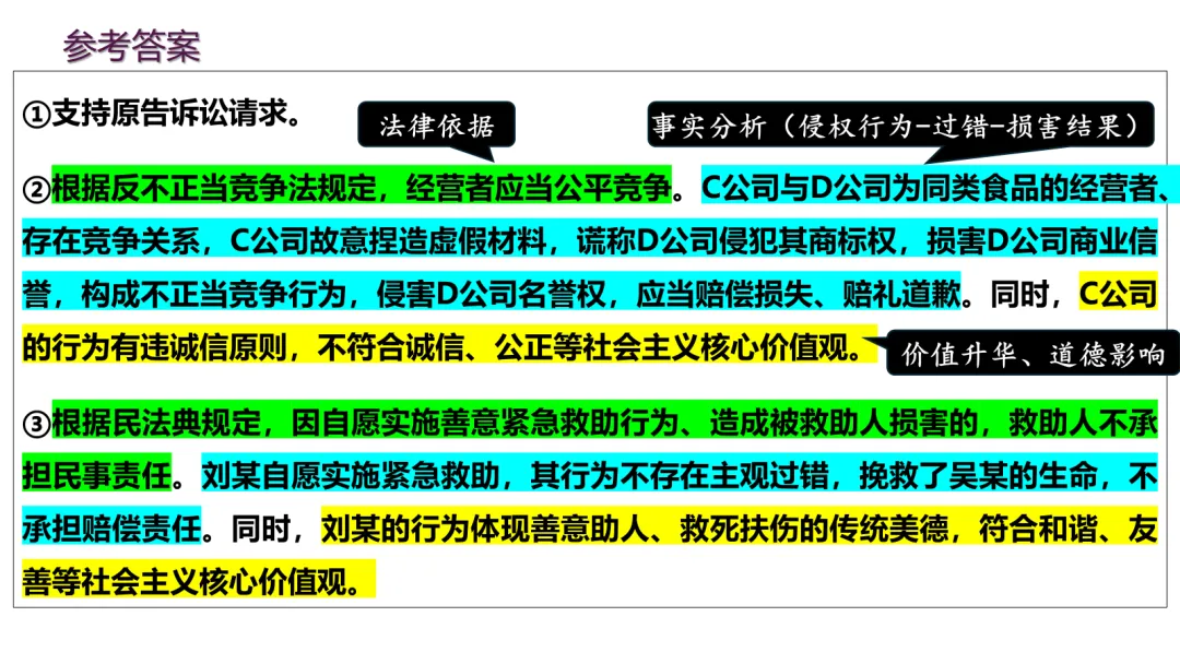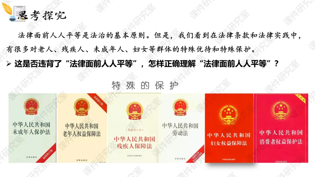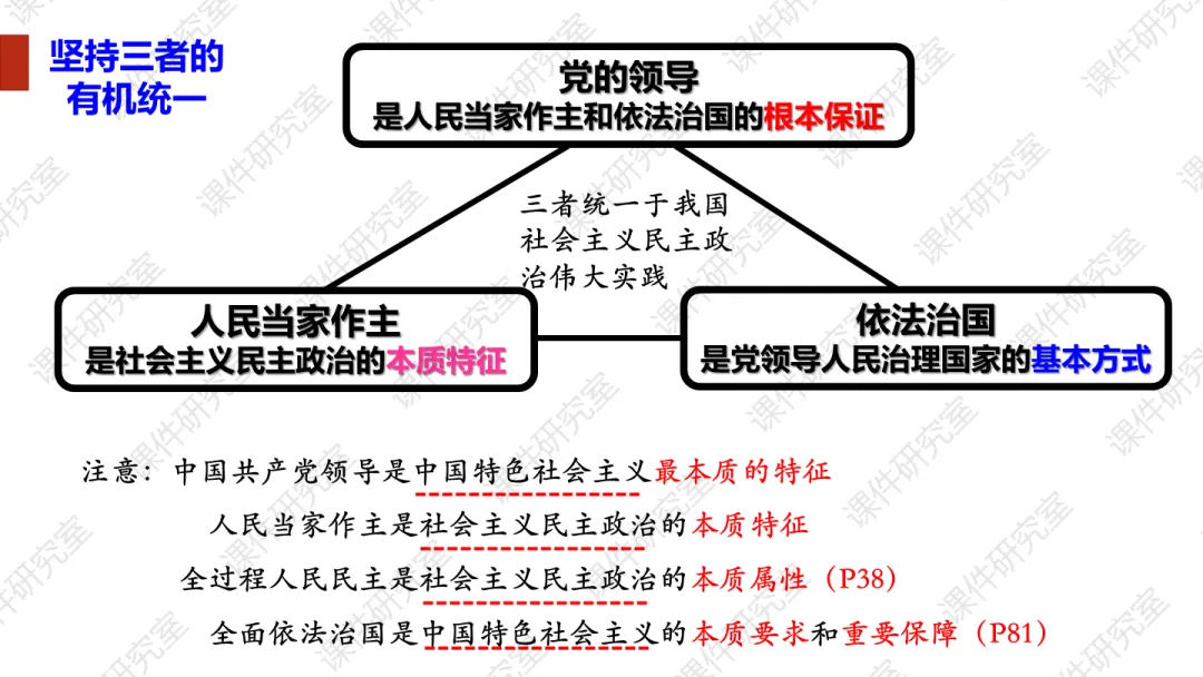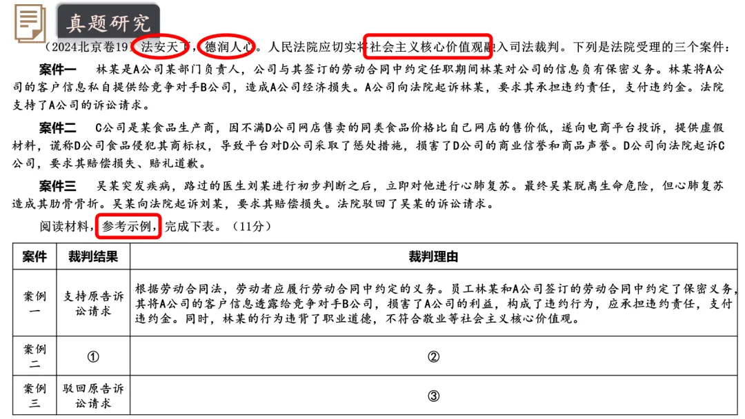 今年最新修订的必修3教材,第七课这里有较大幅度的修订,一处是第80页相关链接“习近平法治思想”;一处是第81页“全面依法治国的总目标”,以往的“贯彻习近平法治思想”改为“贯彻中国特色社会法治理论”。所以我们备课的时候,要梳理一下习近平法治思想的内容和地位,以及和中国特色社会主义法治理论的关系。首先,对于内涵“十二个坚持”,令不少师生有些牢骚。确实,咱们教材中“几个坚持”有点多,在必修1就有“十四个坚持”、贯穿其中的世界观和方法论有“六个坚持”、十九届六中全会总结党百年奋斗成功经验为“十个坚持”;还有“十五五”时期经济社会工作必须牢牢把握“六个坚持”,中央经济工作会议提出“八个坚持”,......这么多的“坚持”看似有点庞杂,其实略加深究不难发现,有些基本结论是想通的,在不同场合可以通用,比如坚持党的领导,比如坚持以人民为中心等。对于习近平法治思想这“十二个坚持”,除了坚持党的领导和坚持以人民为中心,其他诸如依宪治国、依宪执政,中国特色社会主义法治体系,依法治国、依法执政和依法行政,法治国家、法治政府和法治社会,科学立法、严格执法、公正司法和全民守法等,这些都是接下来教材第七、八、九课正文的主要内容。当然,今年新增了一个“坚持依法治国和依规治党有机统一”。第二,为什么第81页“全面依法治国的总目标”中,原来的“贯彻...法治思想”修改为“贯彻中国特色社会主义法治理论”呢?二者是什么关系呢?中国特色社会主义法治理论,可以说是中国特色社会主义理论体系中有关法治的内容;同样,习近平法治思想,可以说是习近平新时代中国特色社会主义思想有关法治的部分。我们可以从中国特色社会主义理论体系和习近平新时代中国特色社会主义思想的关系中来把握。中国特色社会主义理论体系,包括邓小平理论、“三个代表”重要思想、科学发展观和习近平新时代中国特色社会主义思想。同样,中国特色社会主义法治理论,也包括各自的法治思想部分。其实,邓小平理论、“三个代表”重要思想和科学发展观,都有丰富的法治思想部分。比如,早在党的十一届三中全会提出“有法可依、有法必依、执法必严、违法必究”等,党的十五大提出“依法治国是党领导人民治理国家的基本方略”,后来的“依法治国、建设社会主义法治国家”,......这些都是当今法治建设的宝贵思想。这正是教材P80-81“探究与分享”列举的材料内容。这些内容,新授课建议暂时不给学生讲,可以根据情况留待日后复习课的时候补充。清明小假期结束,明天就开始新的备课上课了。接下来说说第七课第二框的课件内容。首先,给学生展示一系列有关法治的重要术语和关键句。从中我们发现,相较于党的领导是“保证”、人民当家作主是“本质”,对于法治出现频率非常高的关键词就是“保障”。这是在考试中选择题选项要注意的关键词:对于第一目“全面推进依法治国的总目标”,以识记背诵为主,尽量节约时间,因为第二目的五个“原则”需要花费课堂较多的时间,特别是对于“坚持人民主体地位”、“坚持法律面前人人平等”、“坚持依法治国和以德治国相结合”这三个原则,还设计了探究问题和案例。今天,任何一部法律的出台,都是民主立法的结果,都是人民群众广泛献言献策的过程,只是“民法典”最具有代表性。所以这里以民法典为素材设计探究,让学生多了解一些民法典。法律面前人人平等,对于“平等”,不只是形式平等,更强调实质平等。对未成年人、老人、妇女、残疾人、消费者、劳动者等群体进行特殊保护,法律的天平倾向于这些特殊群体,才是真正的平等。这个案例我是根据2024年北京卷高考题改编的,也和教材P83的探究与分享相一致。我将北京卷这道高考原题及其解析一并奉上,供大家参考: