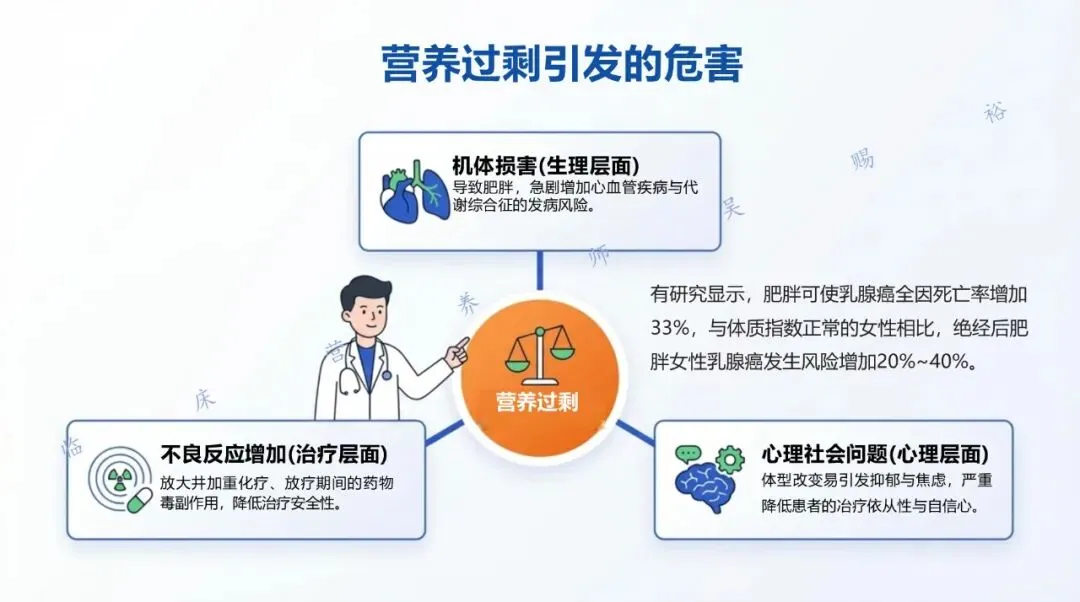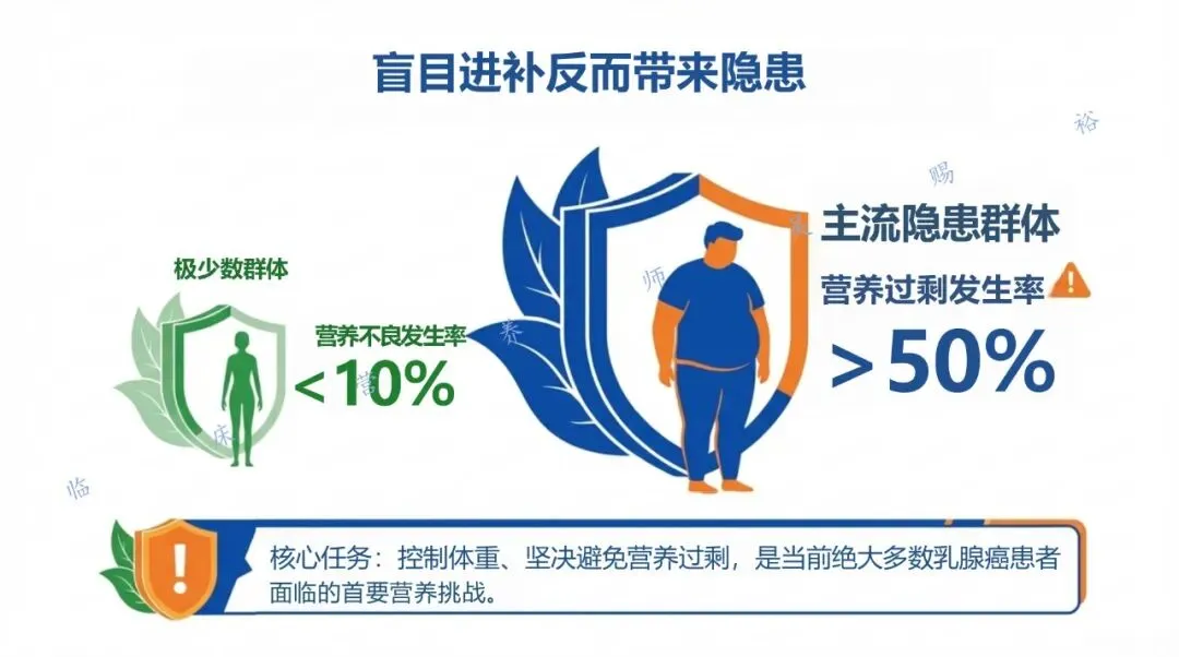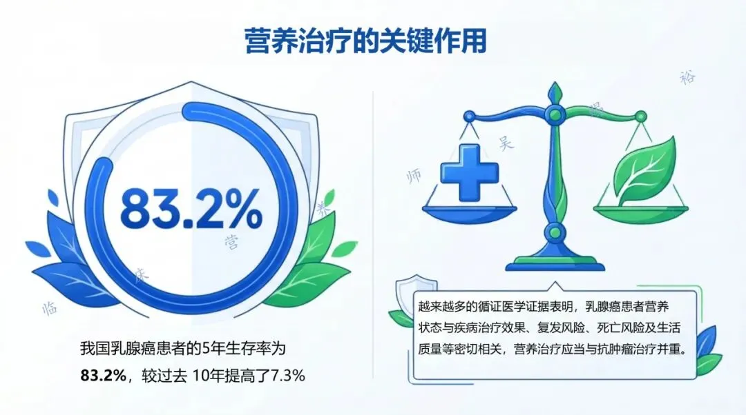 除了手术、放化疗、内分泌及靶向治疗外,营养状态正在被证实与治疗耐受性、复发风险、死亡风险以及生活质量密切相关。