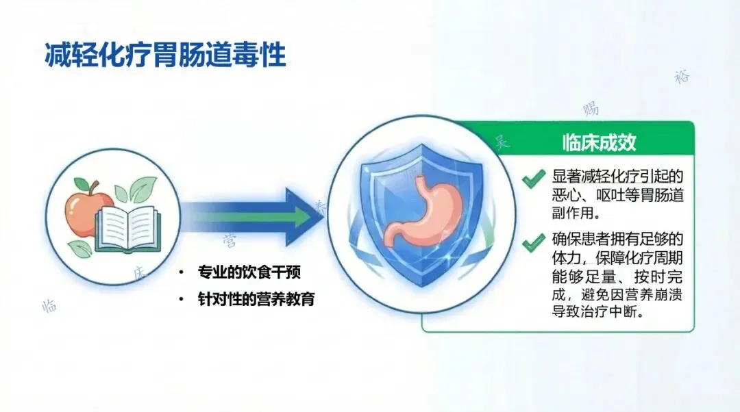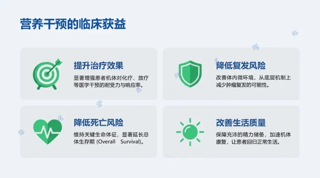 规范、合理的营养干预有助于提高治疗耐受性、改善预后,临床上应与抗肿瘤治疗同步推进。