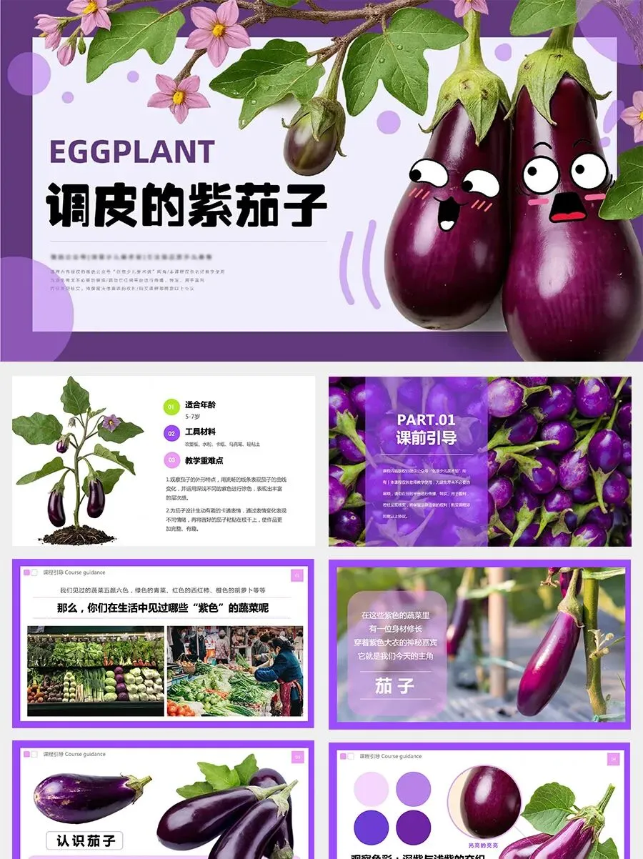 绿色的青菜、红色的西红柿、橙色的胡萝卜……那你们知道吗?在蔬菜家族里,还有一种特别漂亮的颜色——紫色!比如紫甘蓝、紫薯,还有我们今天要认识的主角,它也是紫色的哦。猜猜看是谁呢?对啦,就是我们熟悉的茄子!