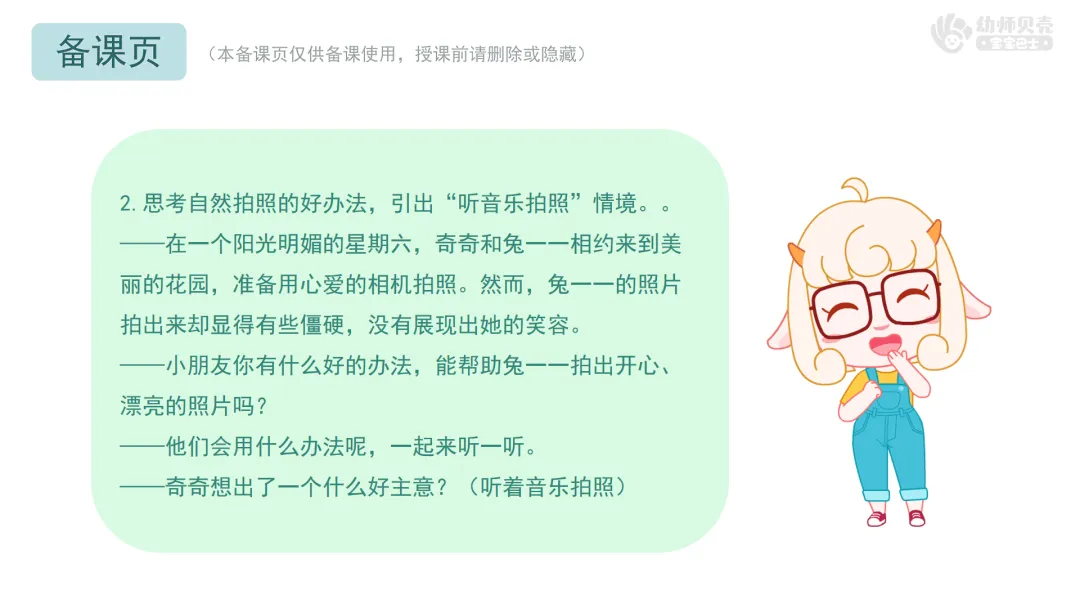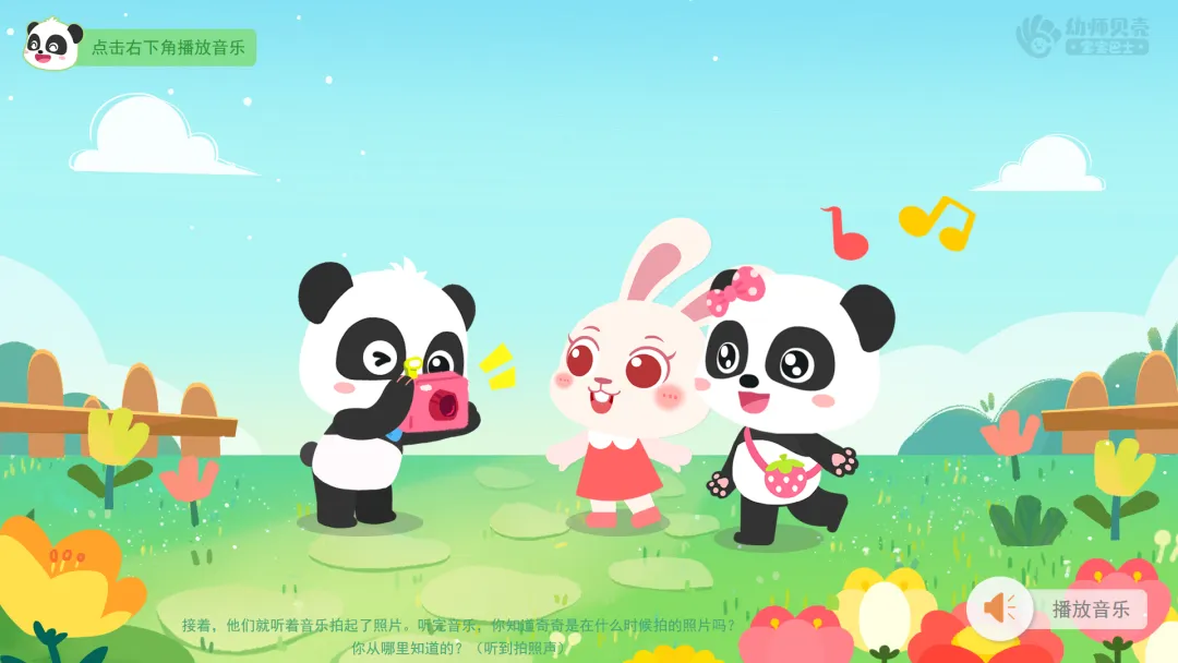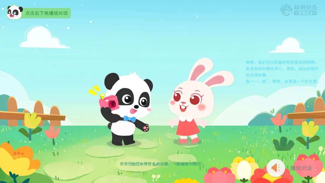 ——现在我们也来当神气的摄影师,和奇奇一起听着音乐,给兔一一拍照吧,看看谁更专业、拍得照片更好看!