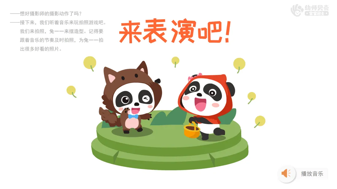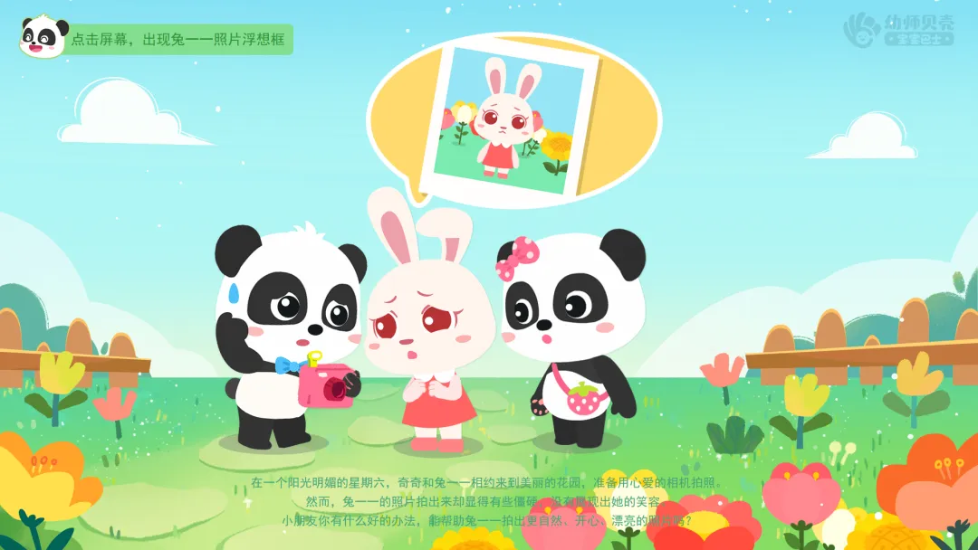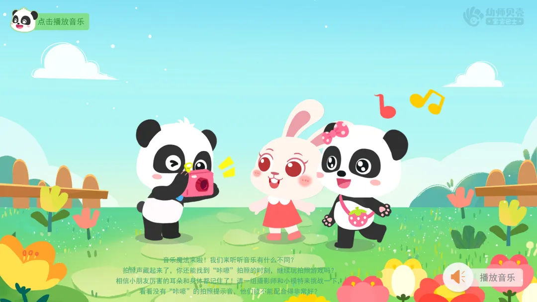 ——接下来,我们听着音乐来玩拍照游戏吧。我们来拍照,兔一一来摆造型。记得要跟着音乐的节奏及时拍照,为兔一一拍出很多好看的照片。