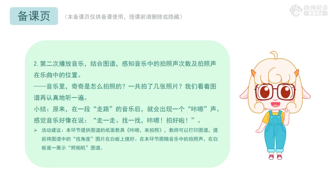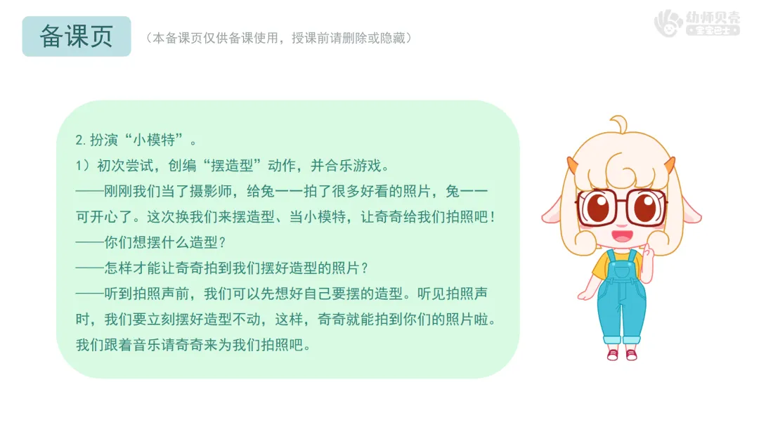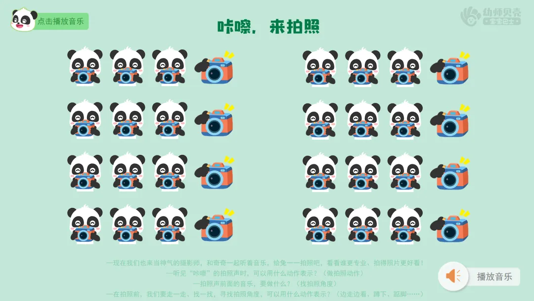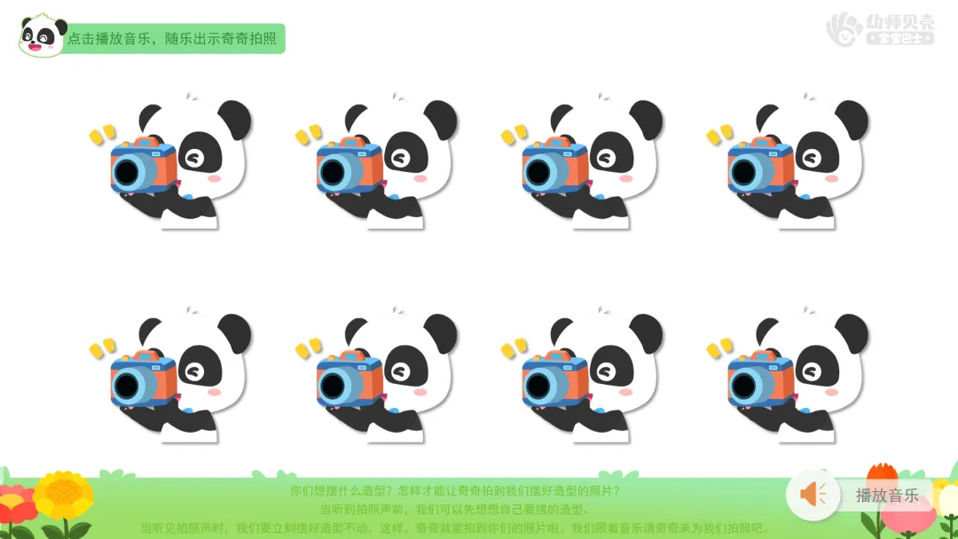 ——听到拍照声前,我们可以先想好自己要摆的造型。听见拍照声时,我们要立刻摆好造型不动,这样,奇奇就能拍到你们的照片啦。我们跟着音乐请奇奇来为我们拍照吧。
