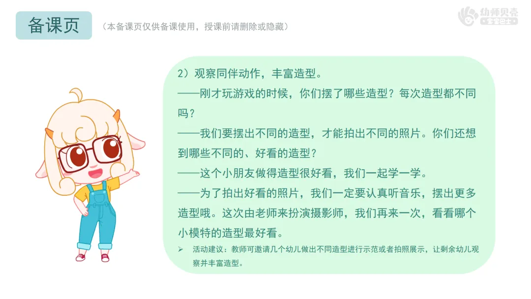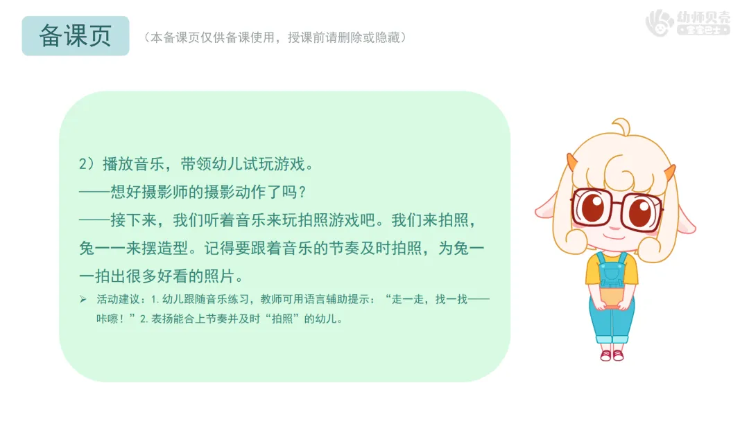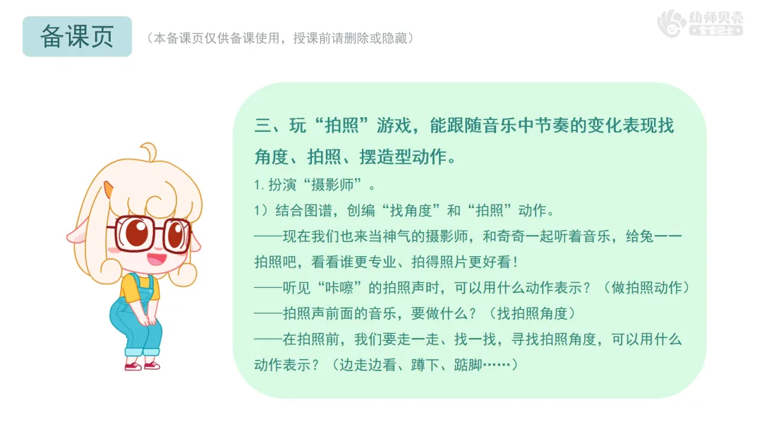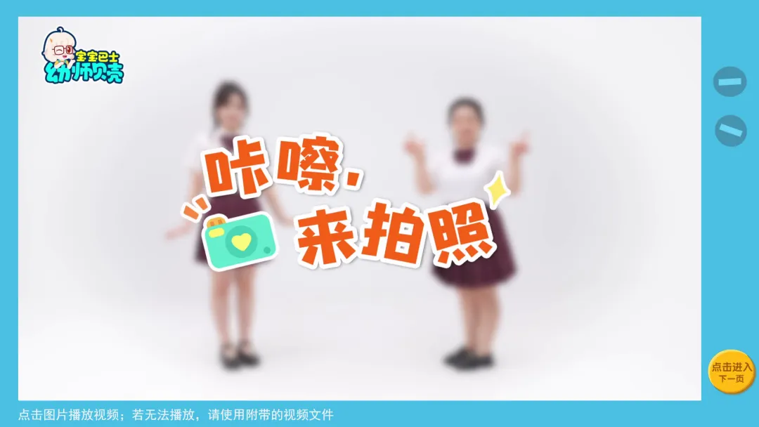 l本活动提供《咔嚓,来拍照》律动视频,教师可参考视频启发幼儿在活动中创编动作。