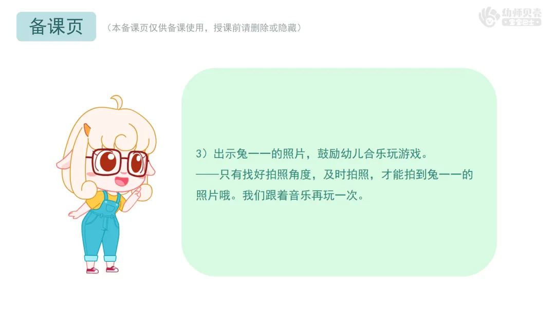 ——只有找好拍照角度,及时拍照,才能拍到兔一一的照片哦。我们跟着音乐再玩一次。