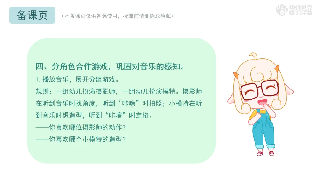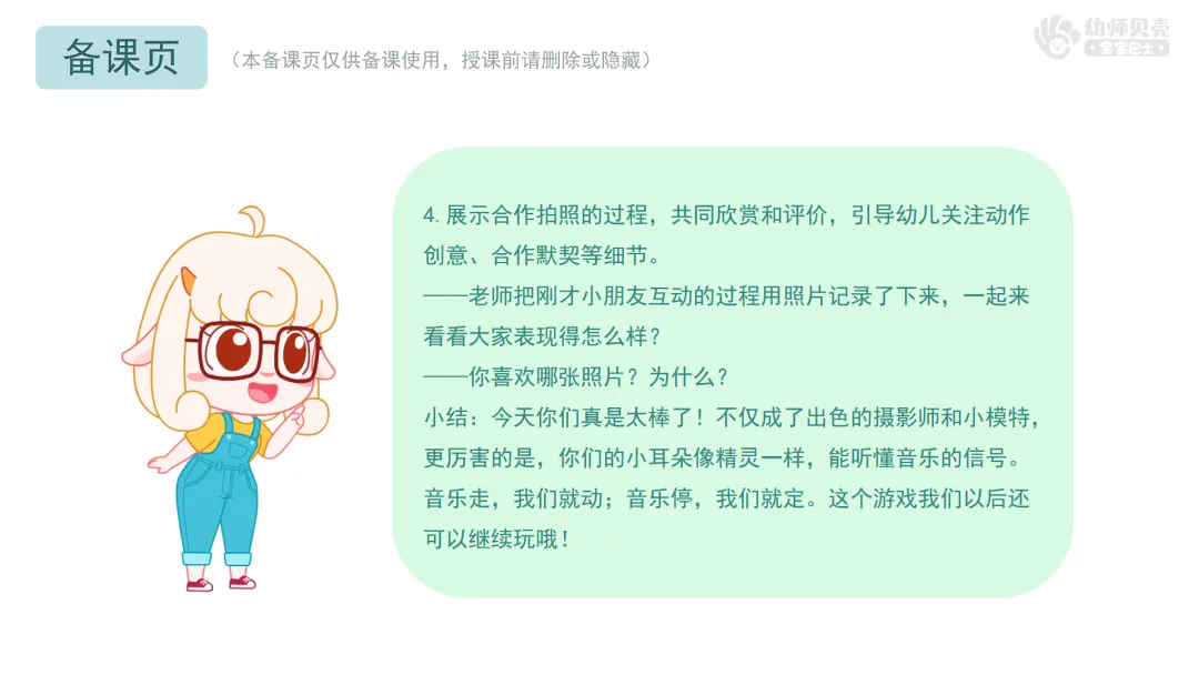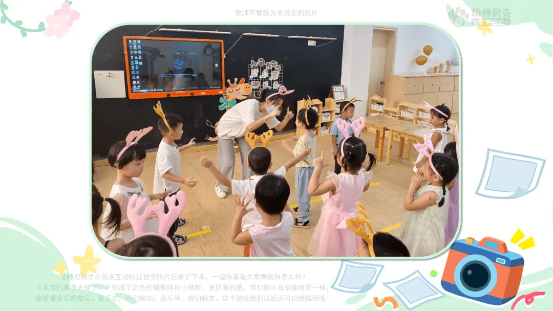 小结:今天你们真是太棒了!不仅成了出色的摄影师和小模特,更厉害的是,你们的小耳朵像精灵一样,能听懂音乐的信号。音乐走,我们就动;音乐停,我们就定。这个游戏我们以后还可以继续玩哦!