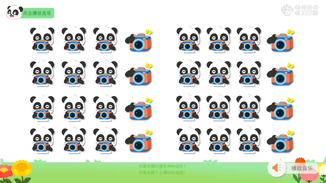 ——为了拍出好看的照片,我们一定要认真听音乐,摆出更多造型哦。这次由老师来扮演摄影师,我们再来一次,看看哪个小模特的造型最好看。