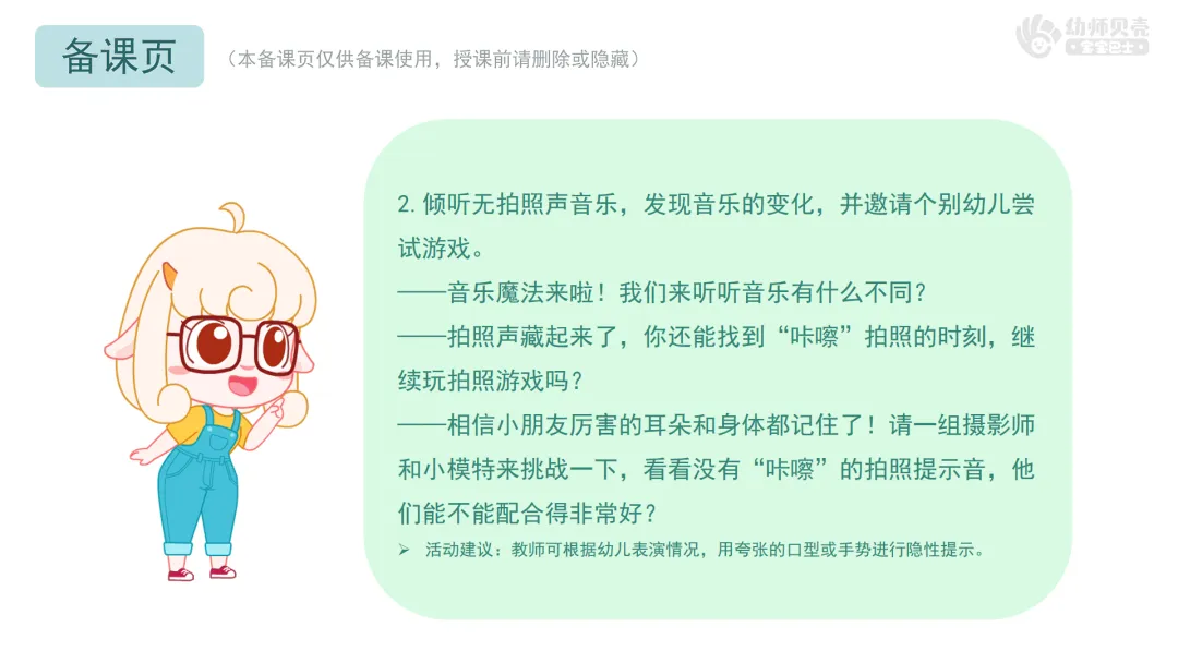 Ø活动建议:本环节提供图谱的纸面教具《咔嚓,来拍照》,教师可以打印图谱,提前将图谱中的“找角度”图片在白板上摆好。在本环节跟随音乐中的拍照声,在白板逐一展示“照相机”图谱。