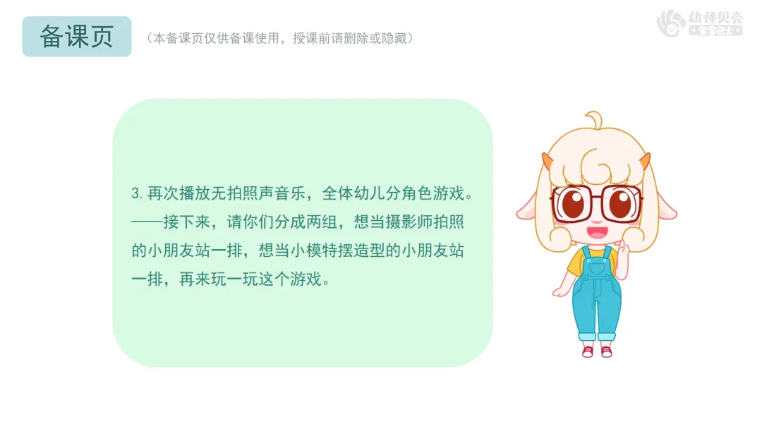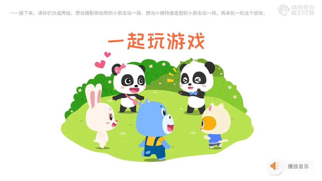 ——接下来,请你们分成两组,想当摄影师拍照的小朋友站一排,想当小模特摆造型的小朋友站一排,再来玩一玩这个游戏。