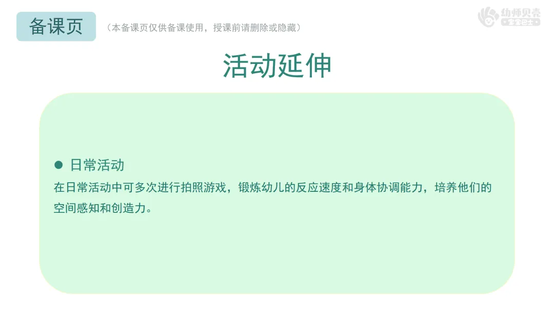 在日常活动中可多次进行拍照游戏,锻炼幼儿的反应速度和身体协调能力,培养他们的空间感知和创造力。