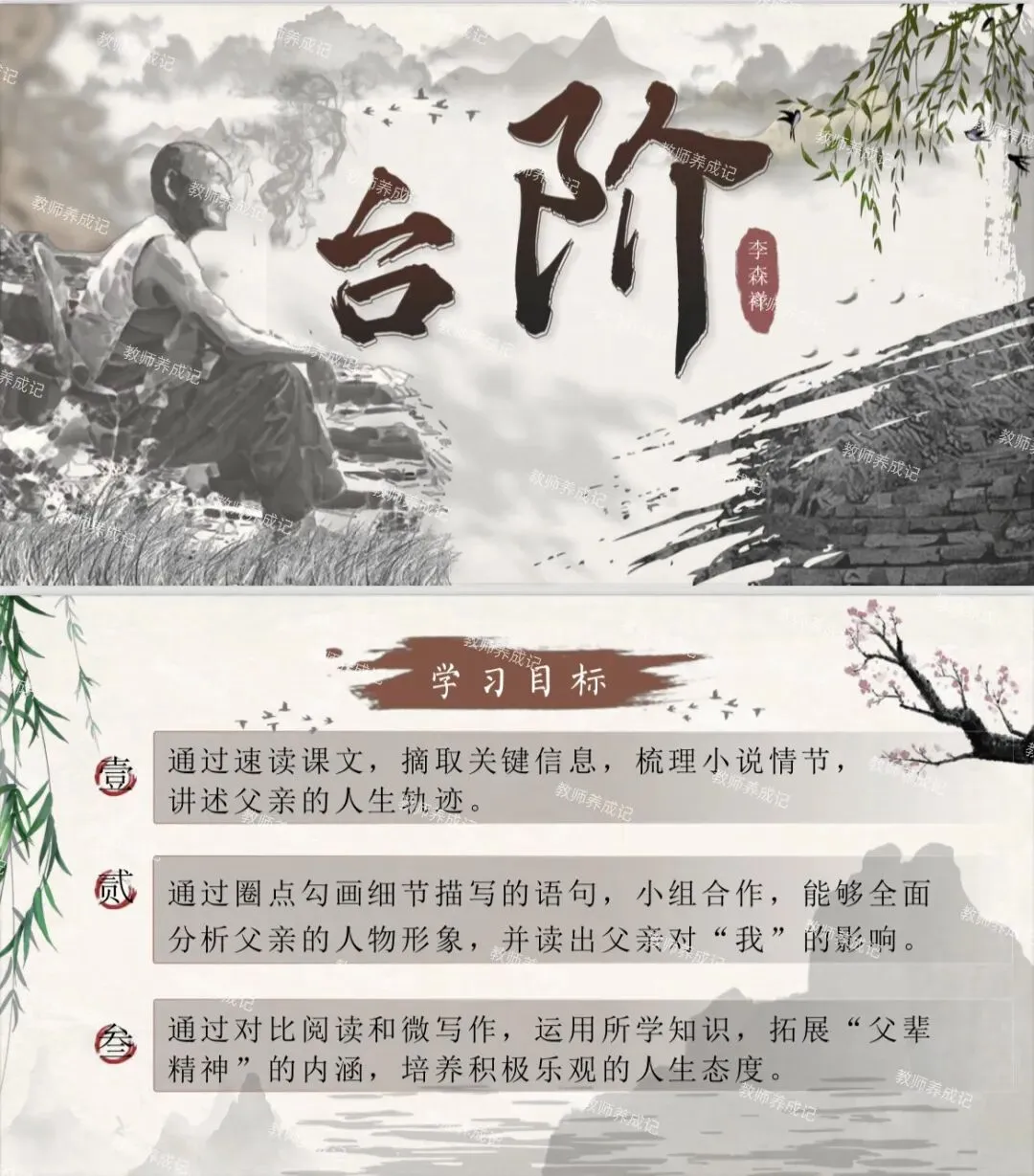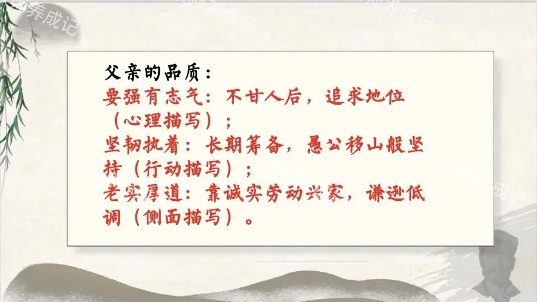 师小结:父亲以他的坚韧、执着和对生活的态度,为“我”树立了榜样,影响了“我”的价值观、人生观和成长路径,使“我”在理解父亲的同时,也找到了自己前行的方向。