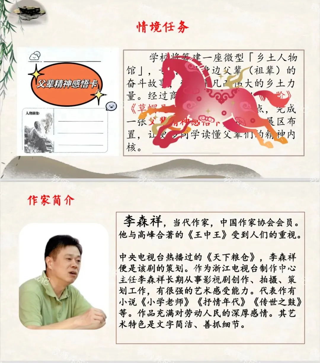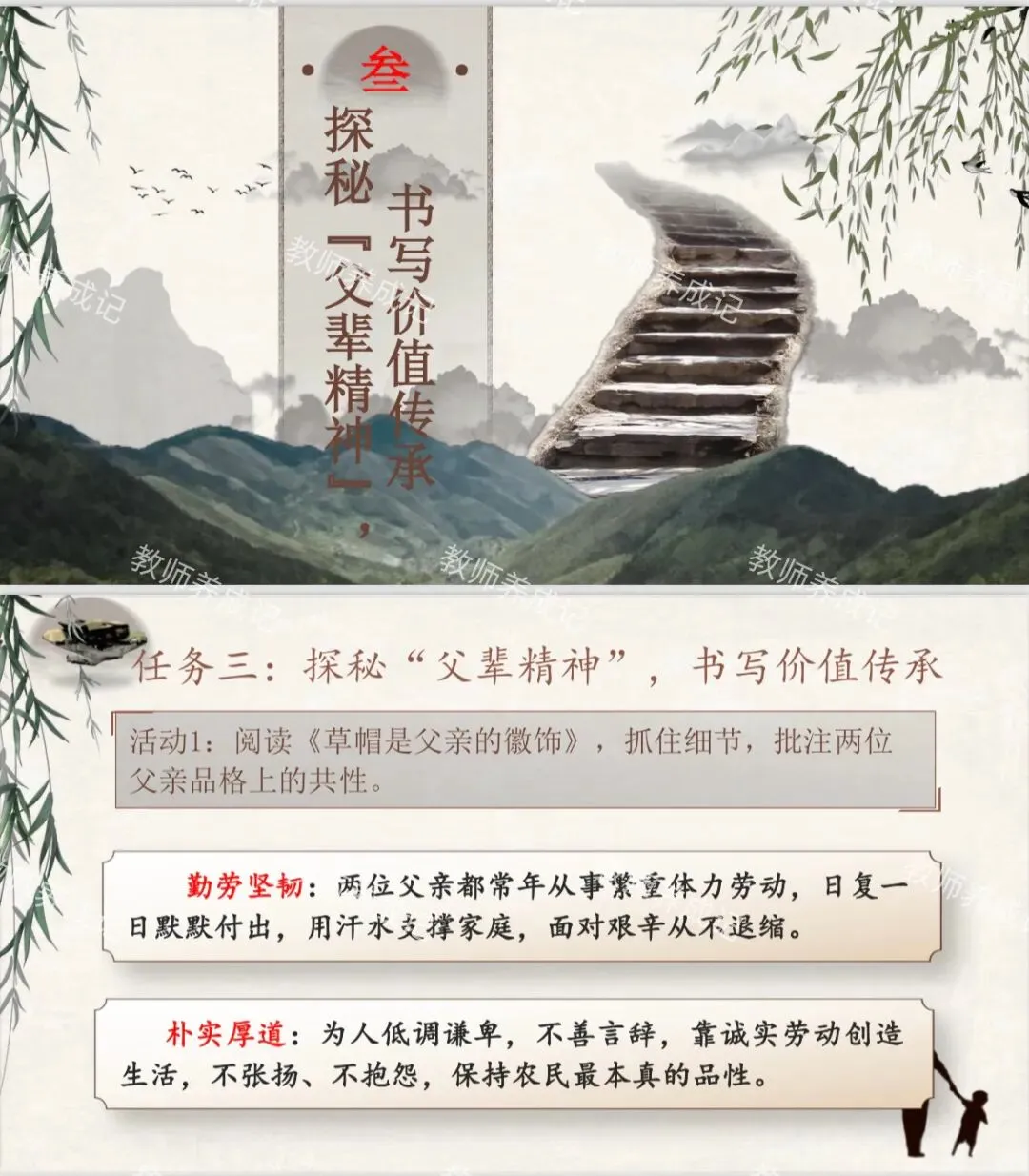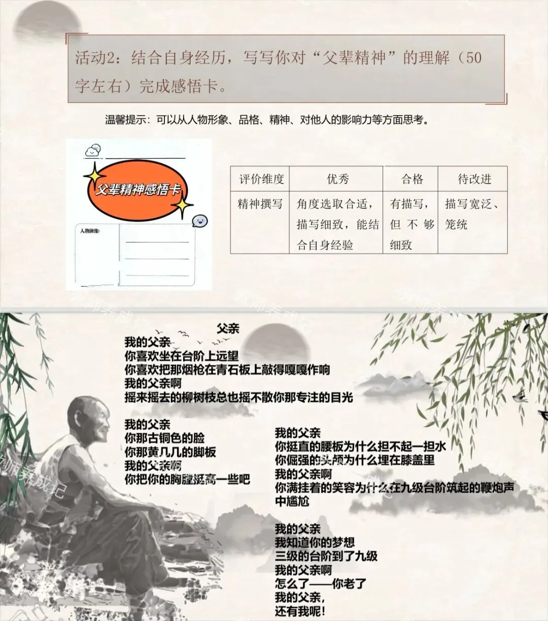 情境任务:学校将筹建一座微型「乡土人物馆」,专门收录身边父辈(祖辈)的奋斗故事,致敬平凡而伟大的乡土力量。经过商讨,我们决定以《台阶》《草帽是父亲的徽饰》为锚点,完成一张父辈精神感悟卡,并参与展区布置,让更多同学读懂父辈们的精神内核。