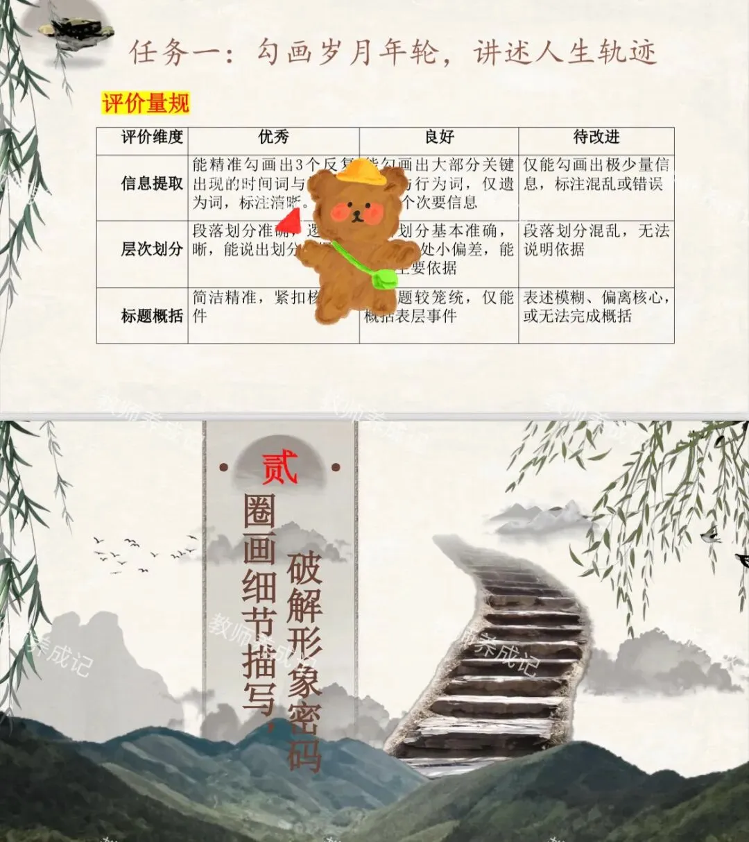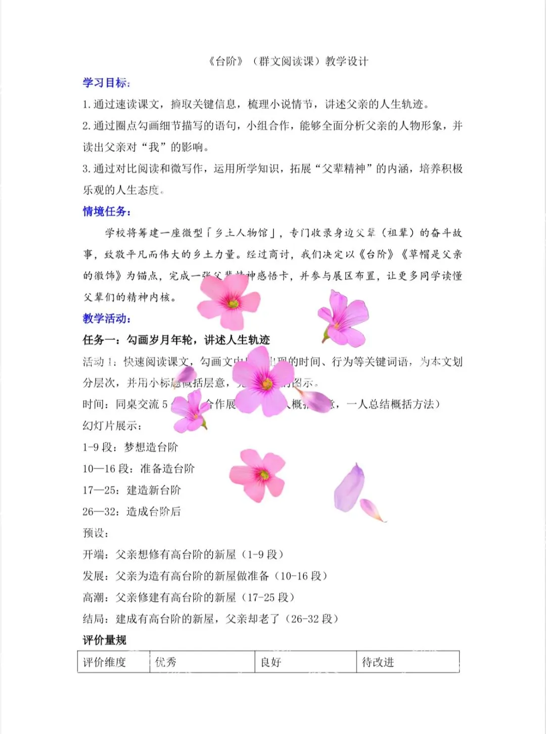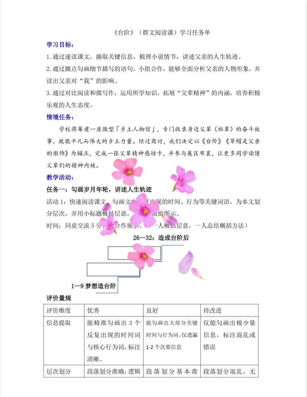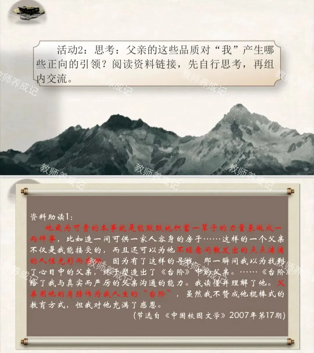 情境任务:学校将筹建一座微型「乡土人物馆」,专门收录身边父辈(祖辈)的奋斗故事,致敬平凡而伟大的乡土力量。经过商讨,我们决定以《台阶》《草帽是父亲的徽饰》为锚点,完成一张父辈精神感悟卡,并参与展区布置,让更多同学读懂父辈们的精神内核。