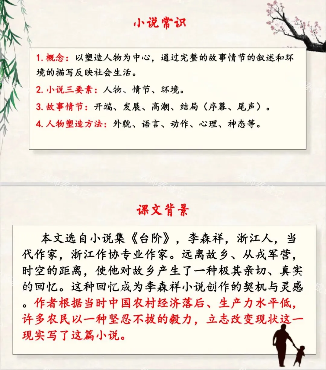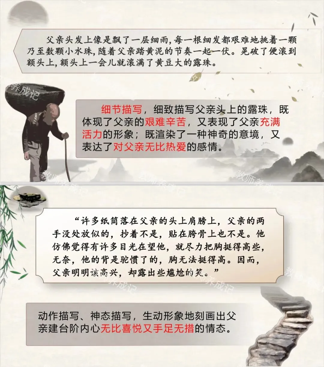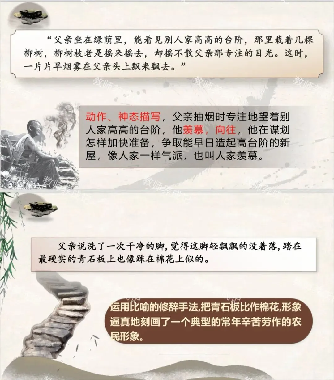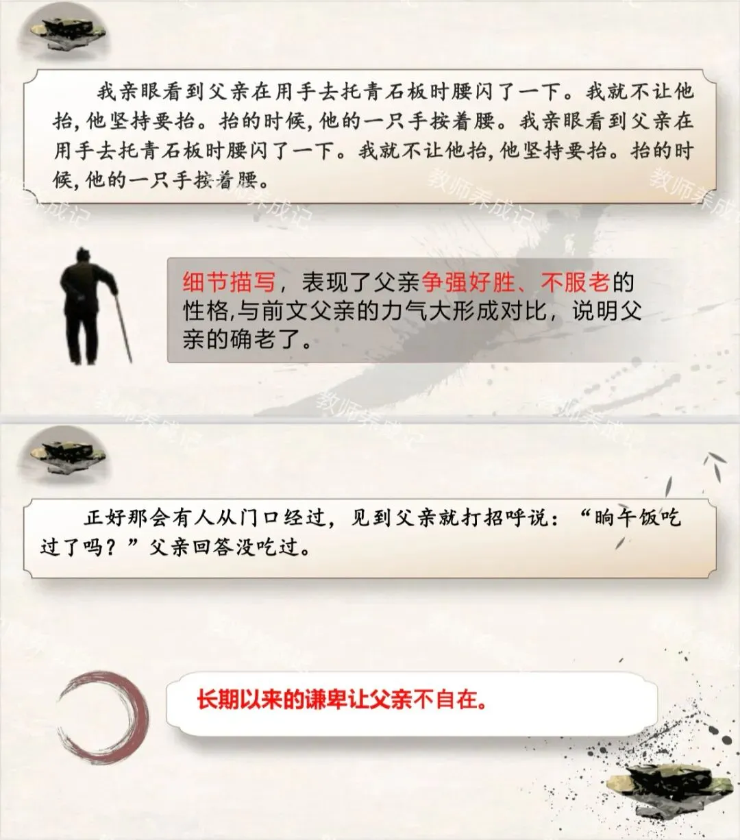 课堂总结:中国传统文化中,父亲长期以来是沉默寡言、为家庭、子女默默付出,一辈子任劳任怨的形象。农民式的父亲,更是如此,他们是平凡的劳动者,干着最脏最重的活,认为能劳动就还有价值,一旦不能劳动,就怅然若失。但正是这些劳动者用一辈子的心血为家庭和子女撑起一片天空,他们也是伟大的,让我们向他们致敬。