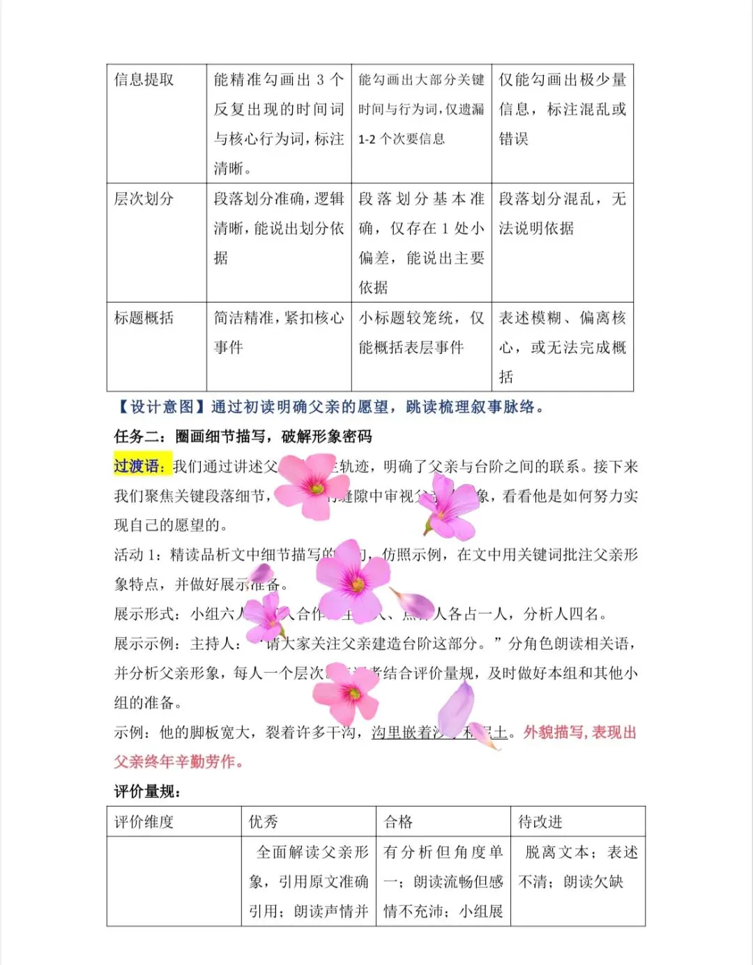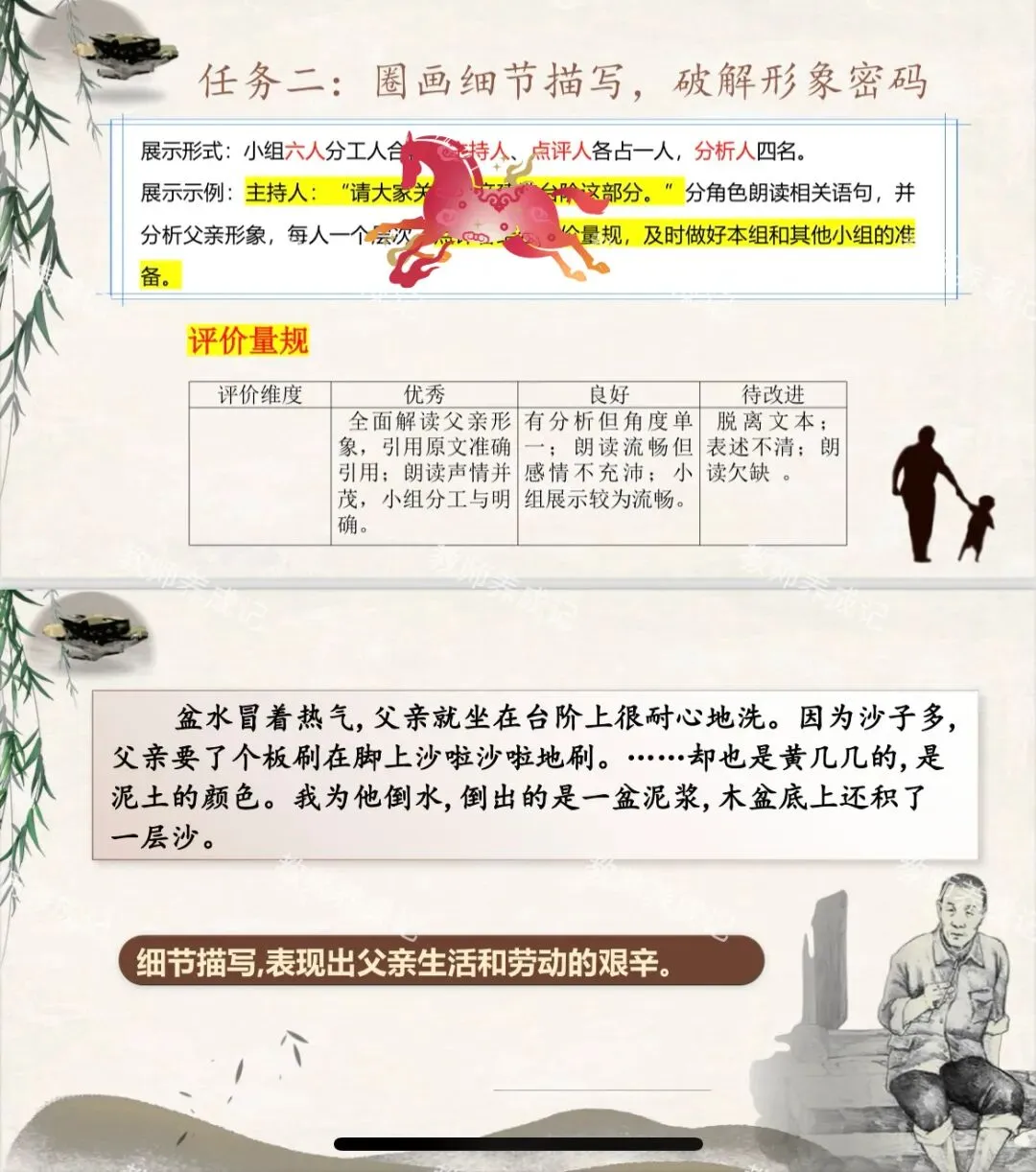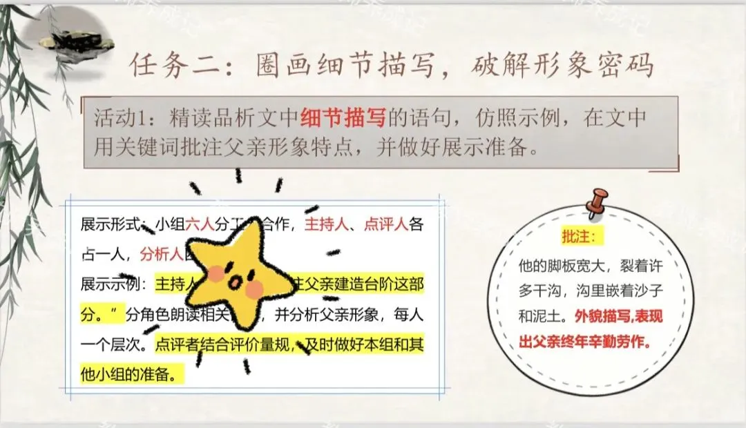 活动1:精读品析文中细节描写的语句,仿照示例,在文中用关键词批注父亲形象特点,并做好展示准备。