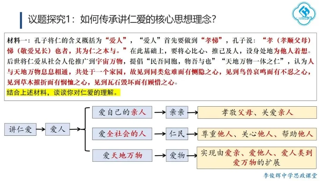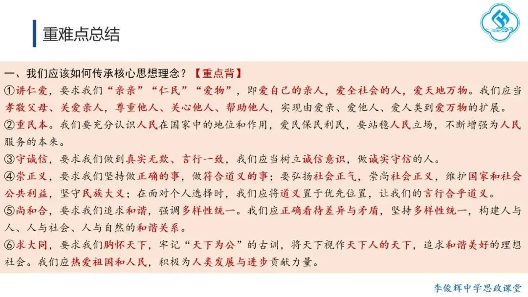 课时设计:上节课我们学习了中华优秀传统文化中的核心思想理念,这些理念在长期生产生活中逐渐凝练为以讲仁爱、重民本、守诚信、崇正义、尚和合、求大同等为主要内容的核心思想理念。本节课将围绕如何传承这些核心理念,逐一讲解它们的内涵与传承要求。