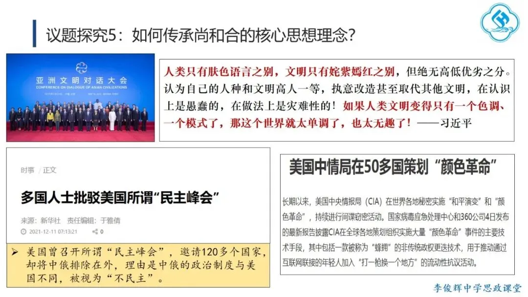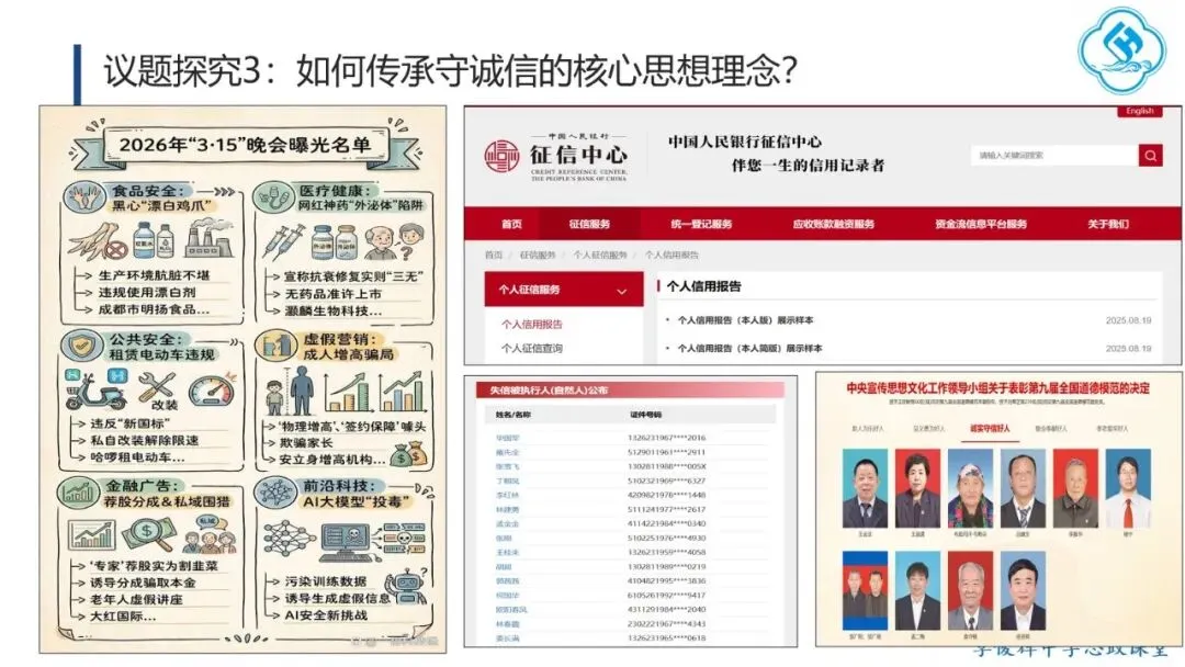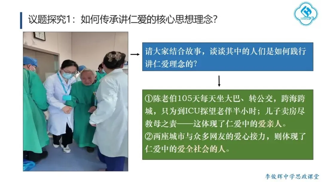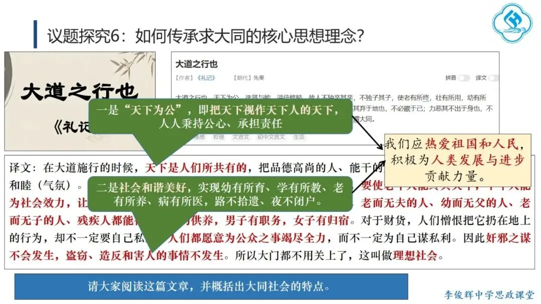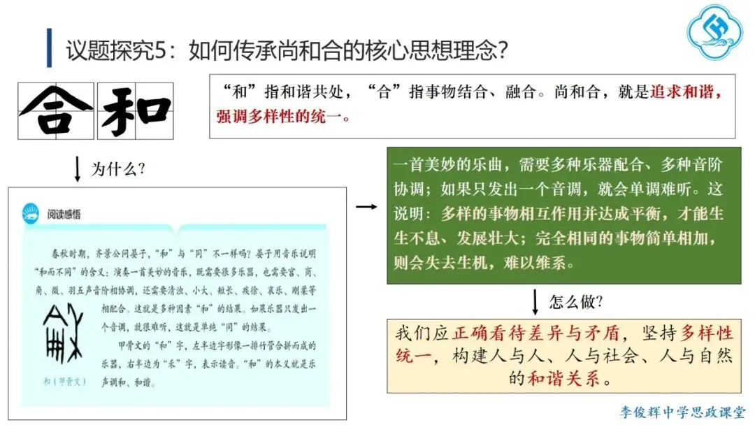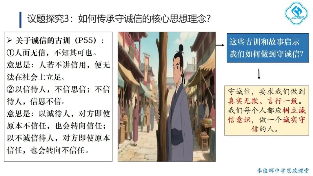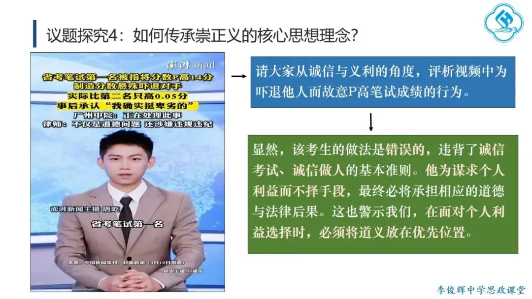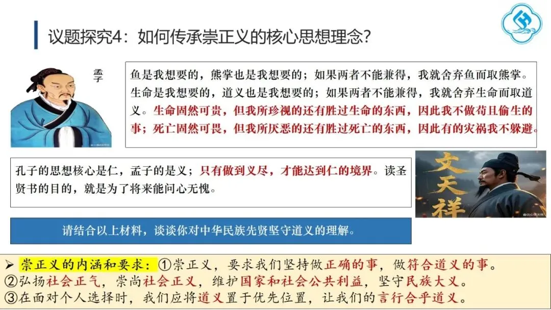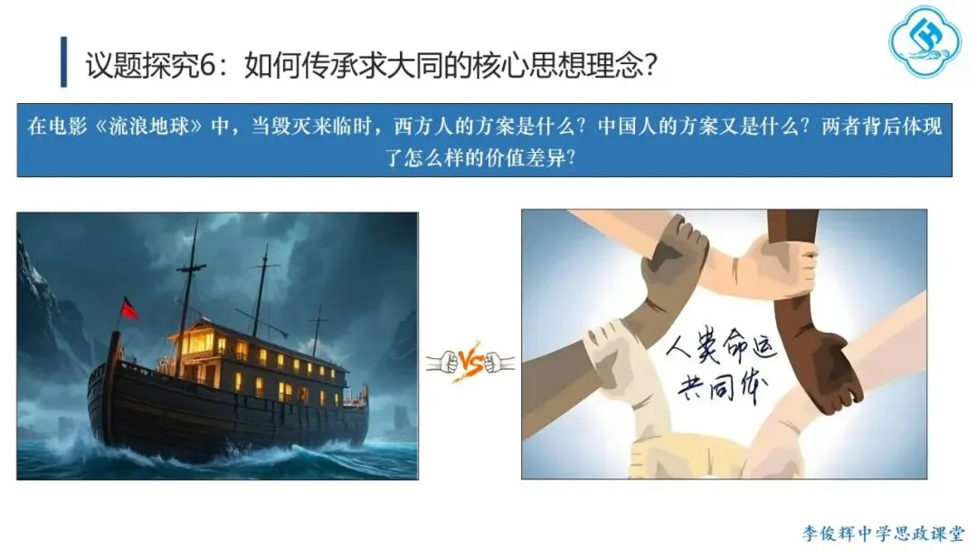 首先,弘扬“讲仁爱”。学生从孔子及后世先哲对“仁”的阐释中,理解其三个层次:亲亲(爱亲人)、仁民(爱众人)、爱物(爱万物),并探讨如何践行仁爱。在此基础上,学生结合“82岁老人跨海探望病妻105天”的感人故事,分析其中体现的仁爱精神,感受仁爱的时代价值。其次,弘扬“重民本”。学生首先从“民为邦本,本固邦宁”和“君舟民水”理解民本内涵,再联系习近平总书记多次引用民本古训及其在梁家河插队时践行民本理念的故事,阐明中国共产党对民本思想的传承。引导学生对比古代民本思想(视民众为统治基础)与新时代“以人民为中心”(人民是国家的主人)的本质区别,增强对党的认同。第三,弘扬“守诚信”。学生结合诚信古训和“徙木立信”的故事,阐明诚信的意义与要求,并联系315晚会打假、社会征信体系建设、惩治老赖、褒扬诚信模范等现实举措,认识诚信的社会价值,自觉做诚信之人。第四,弘扬“崇正义”。学生结合孟子《鱼我所欲也》和文天祥从容就义的故事,理解中华民族先贤对道义的坚守,并运用这一理念评析“广东公考考生P高分‘吓退’对手”的热点事件,警醒自己在利益抉择时将道义放在优先位置。第五,弘扬“尚和合”。教师首先解释“和”“合”之义,并以“演奏音乐需多种乐器配合”为例说明尚和合的意义。进而将中国从万隆会议提出“求同存异”到习近平总书记对文明关系的精妙论述,与美国推行霸权主义、排斥异己的做法进行对比,认同中国以“和合”理念维护国际公平正义、推动国际关系民主化的努力,增强文化自信。最后,弘扬“求大同”。学生结合《礼记·大道之行也》理解大同社会的内涵与特征,对比《流浪地球》中的中国“流浪地球计划”与西方的“诺亚方舟计划”,指出前者是人类命运共同体理念和集体主义价值观的生动体现,后者则折射出追求的个人主义的文化逻辑。引导学生理解人类命运共同体正是大同社会“天下为公”理想的当代实践,在对比中增强认同,坚定“四个自信”。课后,学生在梳理各理念内涵与传承要求的基础上,以小组为单位设计展示活动,进一步加深理解并主动践行。教学提示:一是作为思政课的文化模块,要体现政治性,不能就文化讲文化,而要将文化与政治相联结,引导学生理解党和政府的施政理念植根于千年传统文化,从而增强政治认同。二是紧扣标题《做核心思想理念的传承者》,既要引导学生通过读原文、解原著理解核心思想理念源远流长、博大精深的内涵,更要重在“传承”,讲好我们今天是如何传承核心思想理念的“中国故事”。