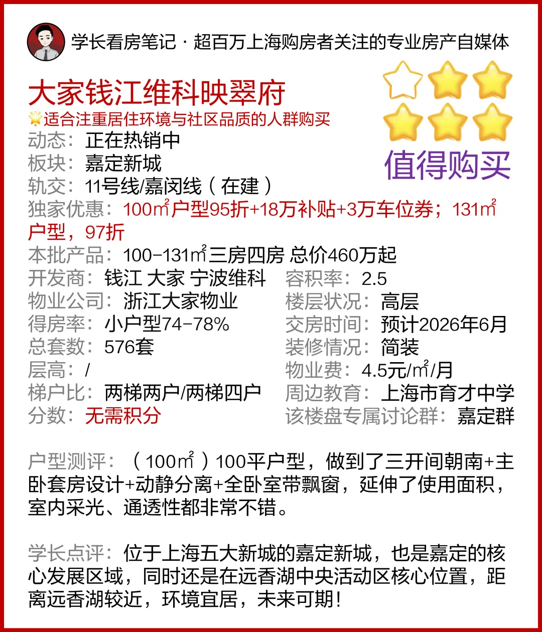 嘉定新城「大家钱江维科映翠府」正在热销中!推出建面约100-131㎡三房四房,总价460万起!