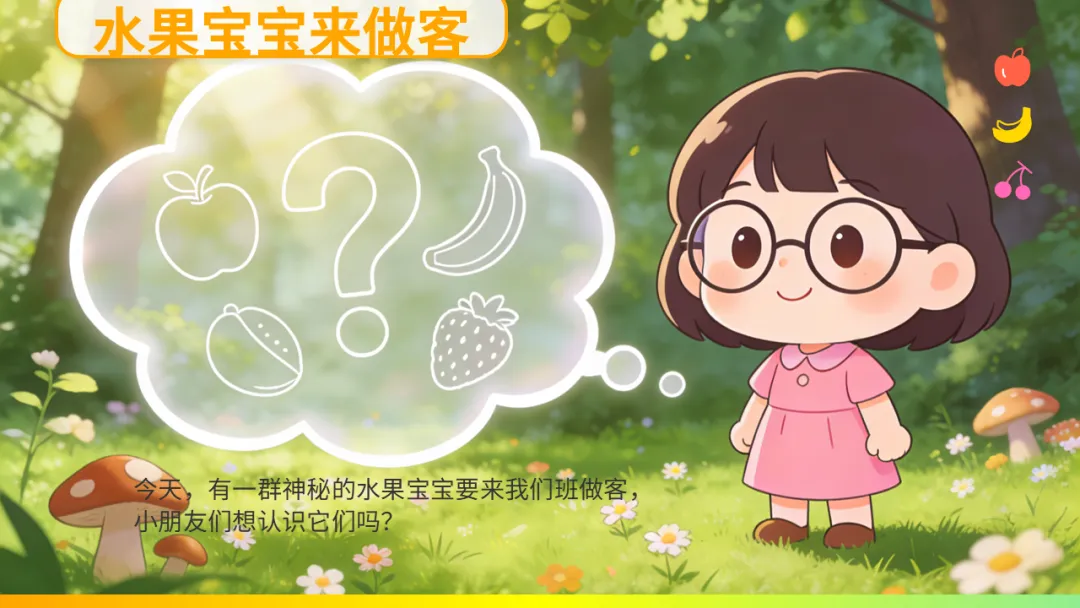 1. 教师活动:播放 PPT 第二页,展示卡通老师和神秘的水果轮廓。提问:“小朋友们,今天有一群神秘的水果宝宝要来我们班做客,你们想认识它们吗?”