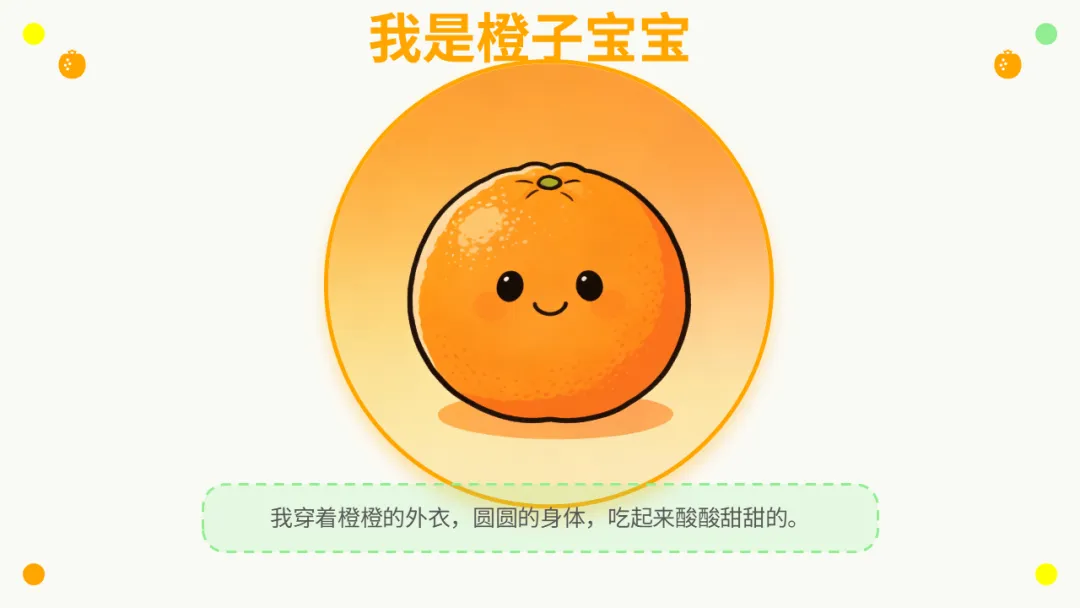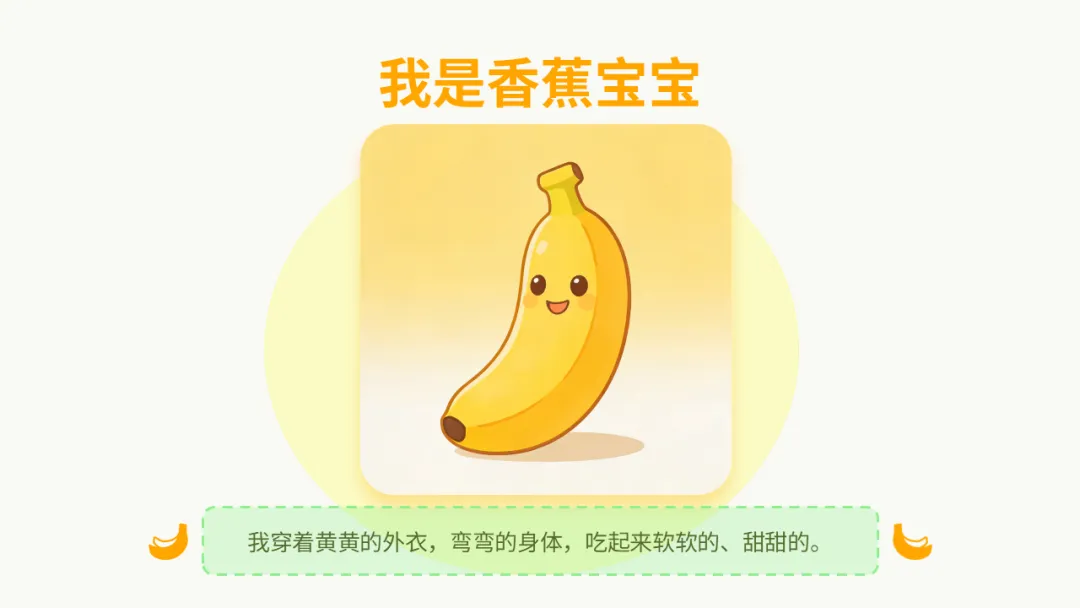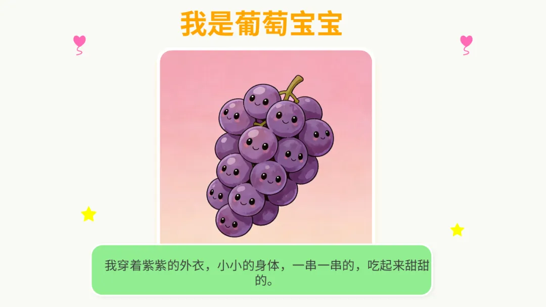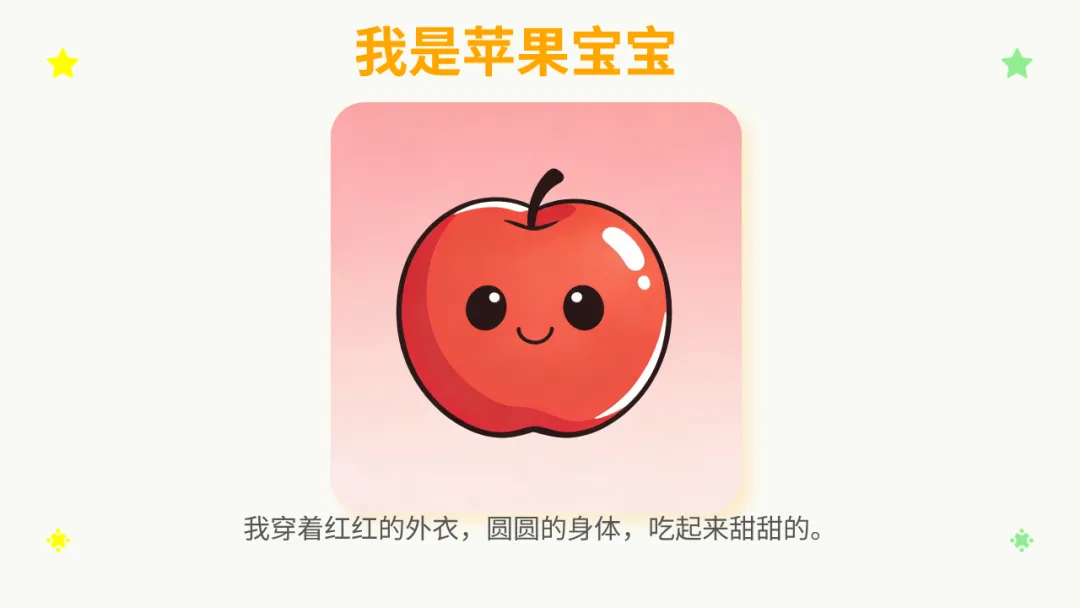 2. 设计意图:利用生动可爱的卡通形象,结合简洁的文字描述,帮助幼儿直观地认识水果的基本特征,符合小班幼儿的认知特点。