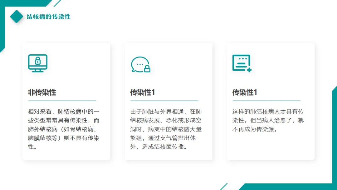 相对来看,肺结核病中的一些类型常常具有传染性,而肺外结核病(如骨结核病、脑膜结核等)则不具有传染性。
