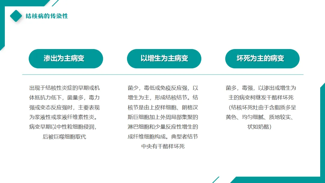 结核菌侵入人体所引起的组织反应,基本上与一般细菌、化学或物理性刺激引起的炎性反应一样,主要有渗出性和增生性病变;如机体抵抗力弱或感染大量毒性强的细菌时,病灶边缘肉芽组织很少,以至产生原发性坏死(变质变化)。