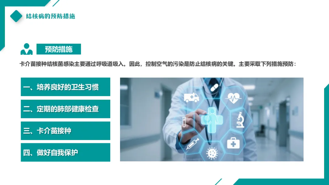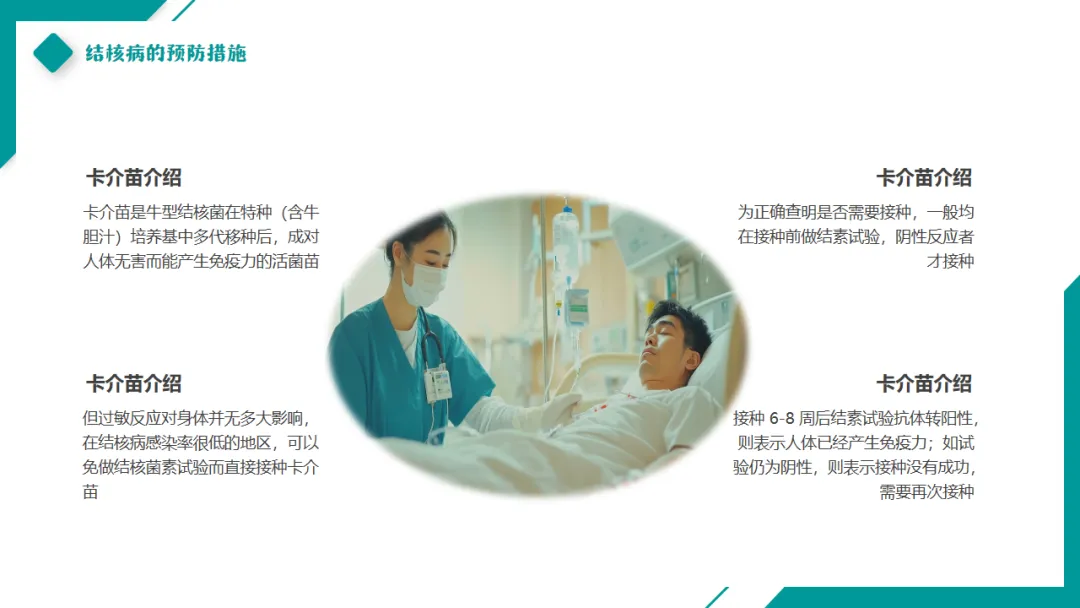 卡介苗接种结核菌感染主要通过呼吸道吸入。因此,控制空气的污染是防止结核病的关键。主要采取下列措施预防: