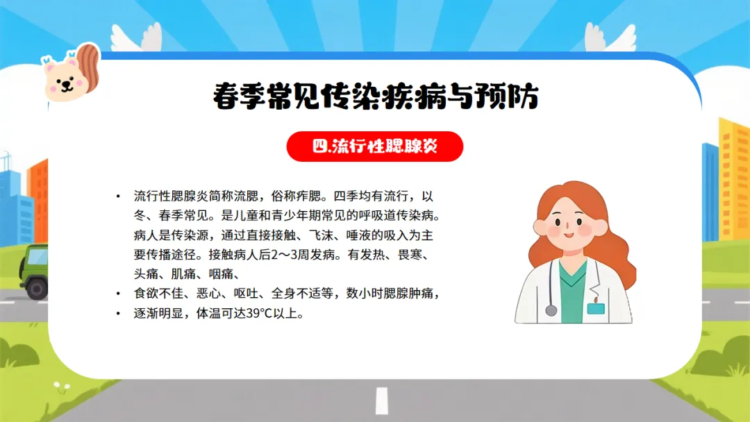 流行性腮腺炎简称流腮,俗称痄腮。四季均有流行,以冬、春季常见。是儿童和青少年期常见的呼吸道传染病。病人是传染源,通过直接接触、飞沫、唾液的吸入为主要传播途径。接触病人后2~3周发病。有发热、畏寒、头痛、肌痛、咽痛、
